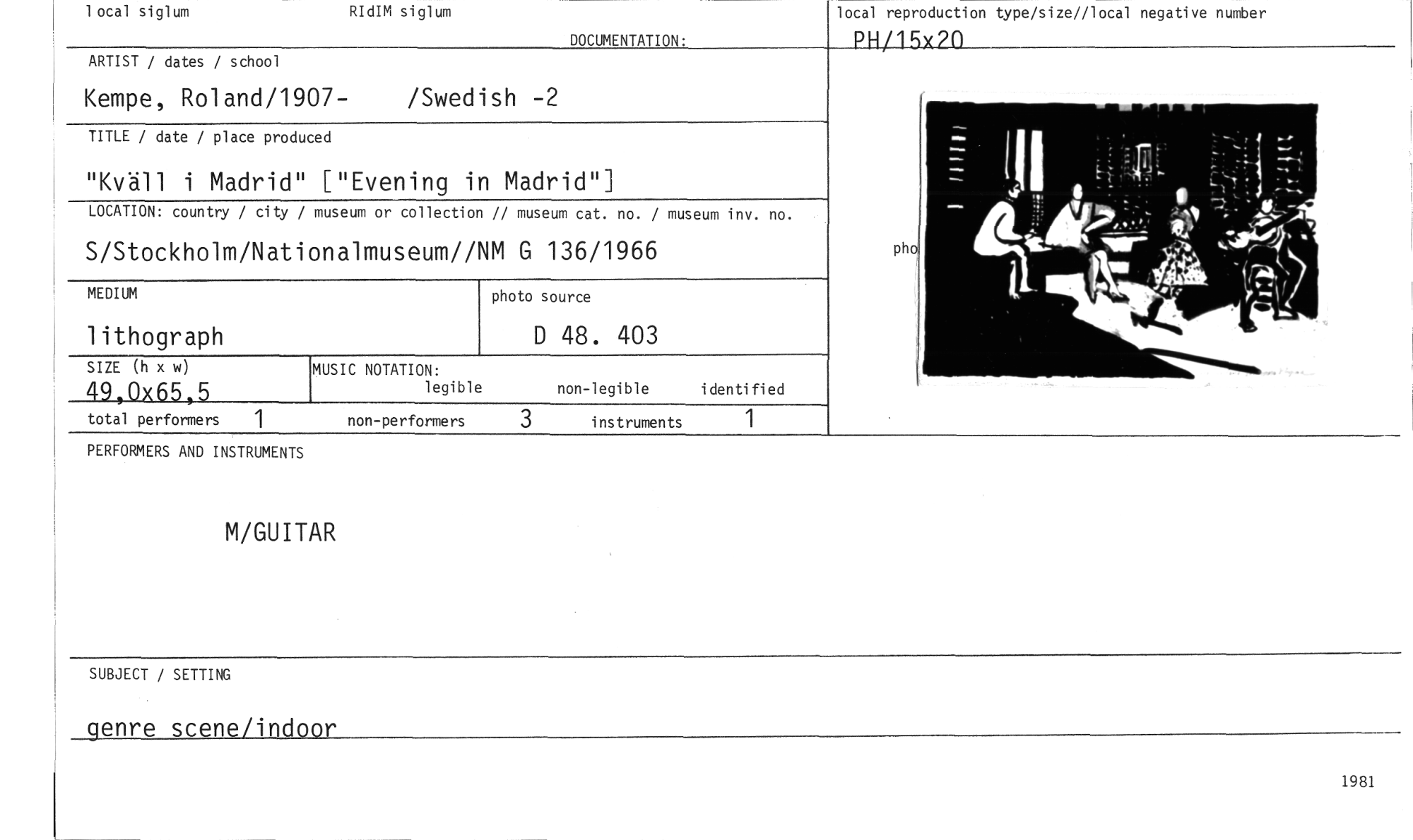 //// local siglum RIdIM siglum //// local reproduction type/size//local negative number //// PH/15x20 //// DOCUMENTATION: //// ARTIST / dates / school //// 1981 //// / date / place produced //// TITLE //// Kempe, Roland/1907- /Swedish -2 //// "Kväll i Madrid" ["Evening in Madrid"] //// LOCATION: country / city / museum or collection // museum cat. no. / museum inv. no. //// S/Stockholm/Nationalmuseum//NM G 136/1966 //// MEDIUM //// D 48. 403 //// SIZE (h x w) //// 49,0x65,5 //// total performers 1 //// lithograph //// MUSIC NOTATION: //// legible non-legible identified //// non-performers 3 instruments 1 //// photo source //// ph //// PERFORMERS AND INSTRUMENTS //// M/GUITAR //// SUBJECT / SETTING //// genre scene/indoor ////