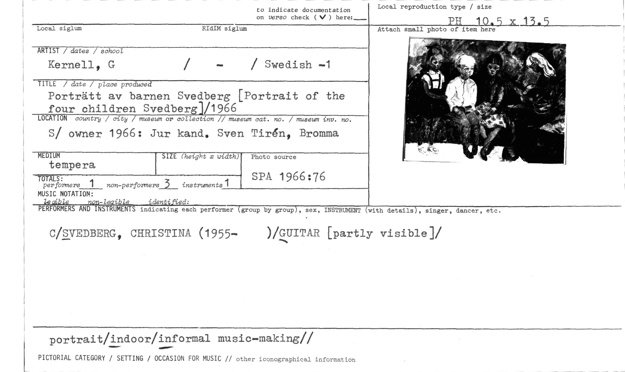 //// to indicate documentation on verso check (N/ ) //// Local reproduction type / size //// PH 10. //// Attach small photo of item here //// Local siglum RIdIM siglum //// x 13.5 //// ARTIST / dates / school //// Kernell, G / Swedish —1 //// TITLE / date / place produced //// Porträtt av barnen Svedberg [Portrait of the four children Svedberg]/1966 //// LOCATION country / city / museum or collection // museum cat. no. / museum inv. no. //// S/ owner 1966: Jur kand. Sven Tir‘n, Bromma //// MEDIUM SIZE (height x width) Photo source //// tempera //// //// //// TOTALS: perfbrmers 1 //// non-performers 3 instruments 1 //// SPA 1966:76 //// MUSIC NOTATION: //// tecib/e non-leaible identified: //// PERFORMERS AND INSTRUMENTS indicating each performer (group //// by group), sex, INSTRUMENT (with details), singer, dancer, etc. //// C/SVEDBERG, CHRISTINA (1955— )/GUITAR [partly visible]/ //// portrait/indoor/informal music—making// //// PICTORIAL CATEGORY / SETTING / OCCASION FOR MUSIC // other iconographical information ////