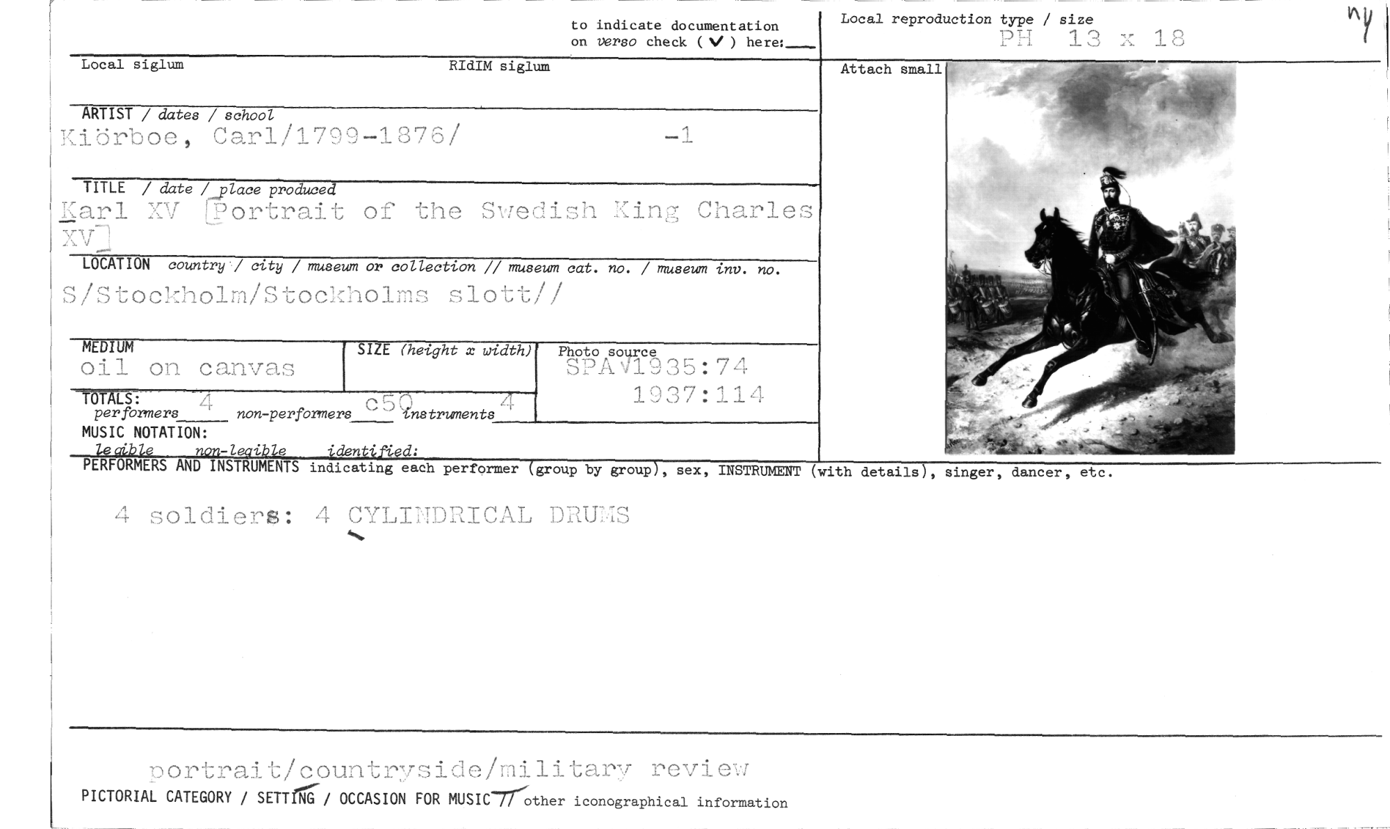 //// to indicate documentation //// on verso check (4.1 ) here: //// Local reproduction type / size //// PH 13 x 18 //// Attach small //// Local siglum RIdIM siglum //// ARTIST / datas / school -1 //// Kibrboe, Carl/1799-1876/ //// TITLE / date /_place produced //// Karl XV Lortrait of the Swedish :in7, Charles XV-1 //// LOCATION country / city / museum or collection // museum cat. no. / museum inv. no. //// S/Stockholm/Stockholms slott!! //// MEDIUM SIZE (height x width) //// oil on canvas //// TO p ALSerf c 5 brmers non-perfbrmers wnstruments4 //// T: 0 //// MUSIC NOTATION: //// RFORMERS AND INSTRUME indicating each perfermer group //// 4 soldiers: 4 CYLINDRICAL DRUMS //// 1937:114 //// by group //// sex, INSTRUMENT //// ,gortrait/countr7side/militarv review //// PICTORIAL CATEGORY / SETTING- OCCASION FOR MUSIC // iconographical information ////