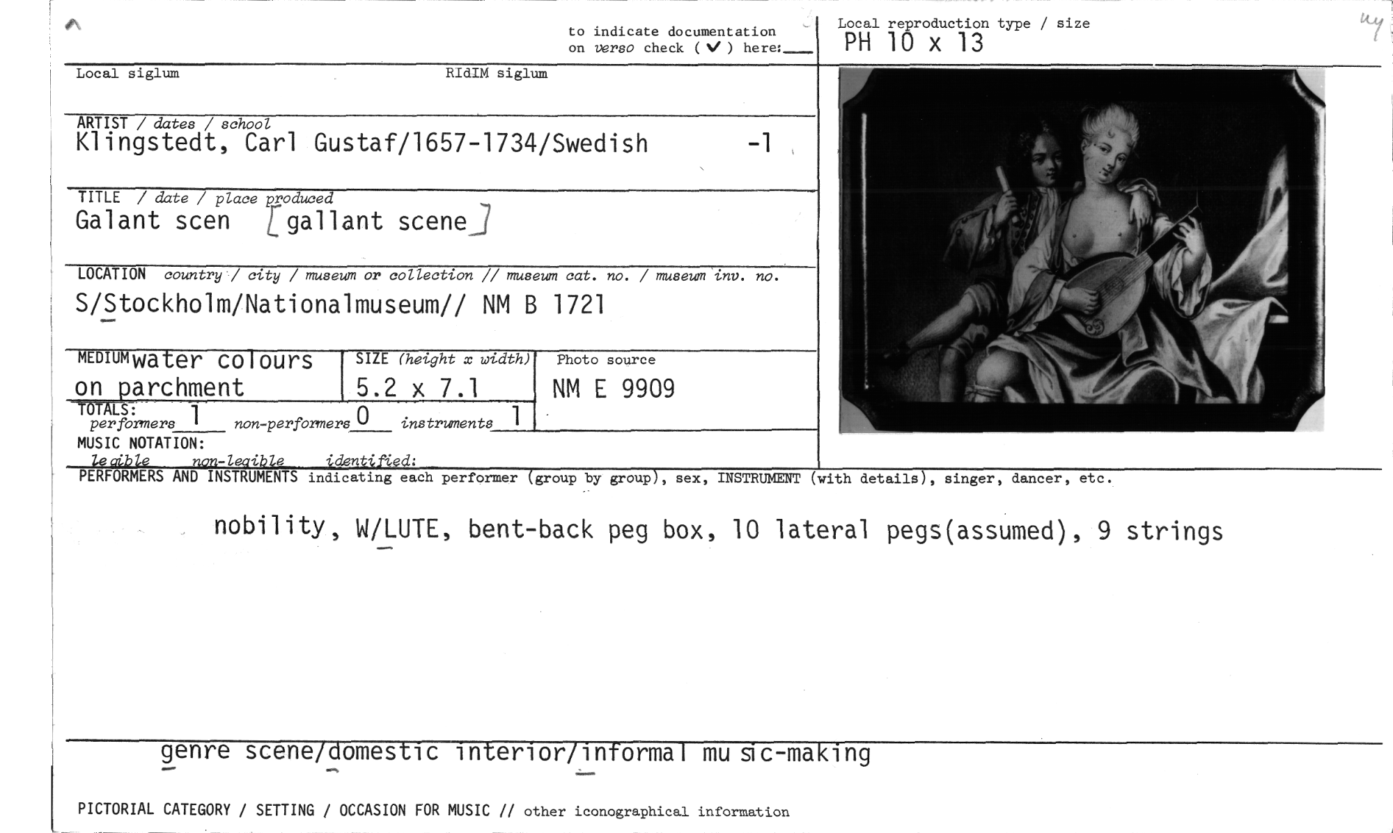 //// to indicate documentation on versa check (NI ) here: //// Local reproduction type / size //// PH 10 x 13 //// Local siglum RIdIM siglum //// ARTIST / dates / school //// Klingstedt, Carl Gustaf/1657-1734/Swedish //// TITLE / date / place produced //// Galant scen Egallant scene.] //// LOCATION country / city / museum or collection // museum cat. no. / museum tnv. no. //// SIZE (height x width) //// ()n parchment 5.2 x 7.1 //// Toi. //// ALS: //// perfbrmers 1 I non-performers 0 instruments 1 //// S/Stockholm/Nationalmuseum// NM B 1721 MEDIUM water coiours //// NM E 9909 //// Photo source //// MUSIC NOTATION: //// leurib/e nnn-lecrible identilUd: //// PERFORMERS AND INSTRUMENTS indicating each performer (group by group), sex, INSTRUMENT (with //// details), singer, dancer, etc. //// nobility, W/LUTE, bent-back peg box, 10 lateral pegs(assumed), 9 strings //// genre scene/domestic interlor/intormal mu sic-making //// PICTORIAL CATEGORY / SETTING / OCCASION FOR MUSIC // other iconographical information ////