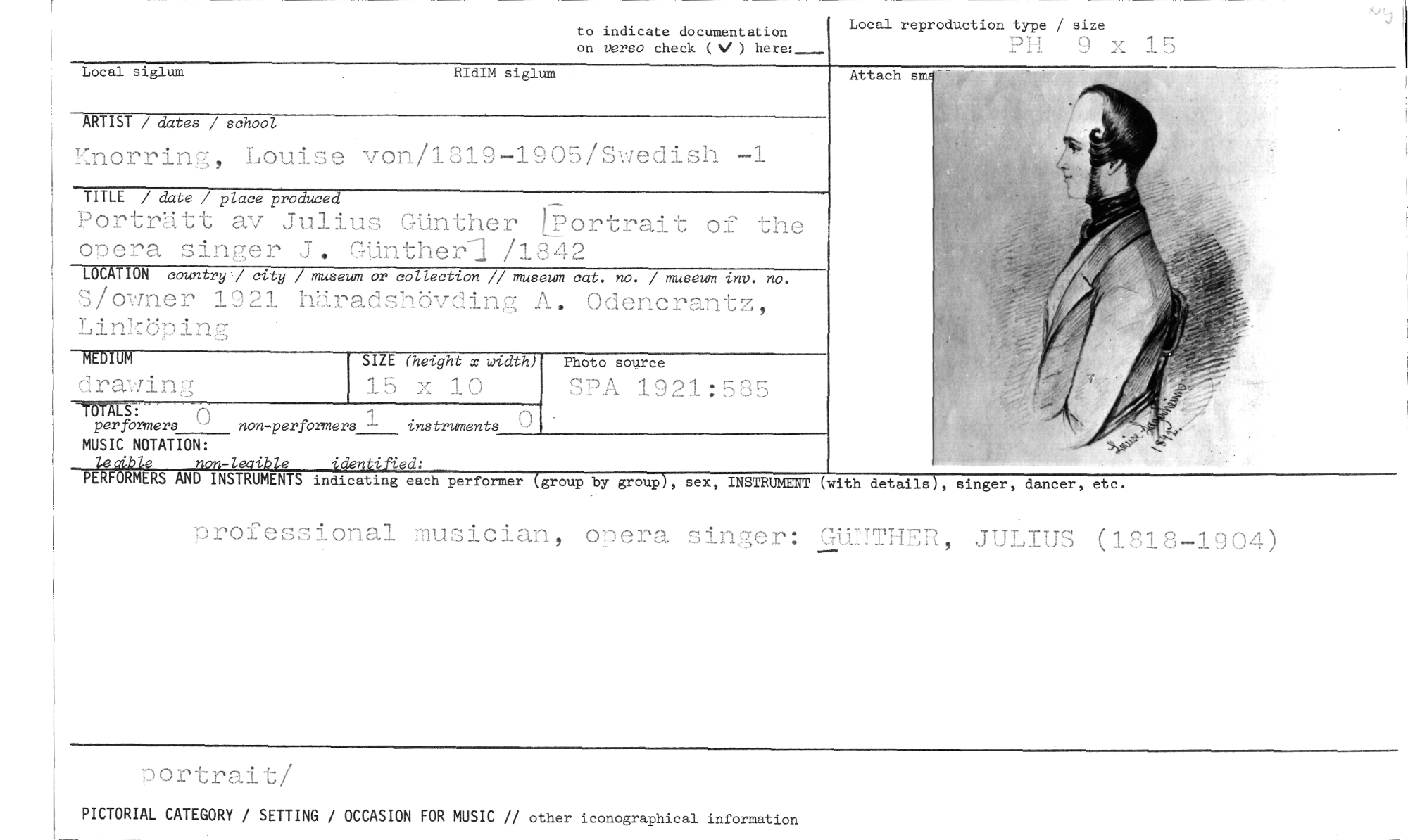 //// to indicate documentation on versa check (/) //// Local reproduction type / size //// Pp n //// Local siglum RIdIM siglum //// ARTIST / dates / school //// Knorring, Louise von/1319-1905/Swedish //// TITLE / date / place produced //// Porträtt av Julius GUnther LPortrait of the opera singer J. GUnther2 /1842 //// LOCATION country./ city / museum or collection // museum cat. no. / museum inv. no. //// S/owner 1921 häradshövding A. Ociencrantz, Linköping //// Photo source //// SPA 1921:535 //// MUSIC NOTATION: //// 4eoible non-leaikle identilKed: //// 'ffrALS: 0 //// per formers non-perfOrmers 1 instruments 0 //// MEDIUM ISIZE (height x width) 15 x 10 //// c7rawing //// Attach sm //// PERFORMERS AND INSTRUMENTS indicating each performer (group by group), sex, INSTRUMENT (with details), singer, dancer, etc. //// orofessional musician, onera singer: GUNTHER, JULIUS (1318-1904) //// ortrait/ //// PICTORIAL CATEGORY / SETTING / OCCASION FOR MUSIC // other iconographical information ////