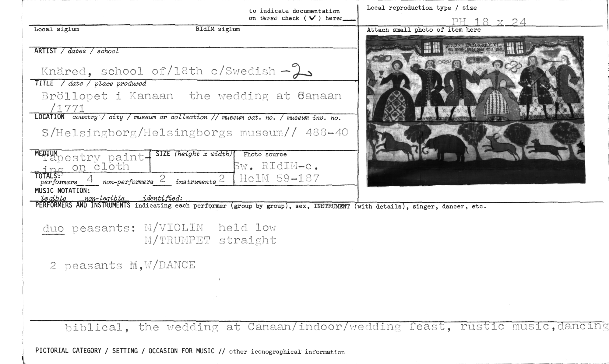 //// details), singer, dancer, etc. //// INSTRUMENT (with //// Local siglum //// to indicate documentation //// on versa check (%e ) here:— //// ARTIST / dates / school //// Knäred school of/18th c/Swedish //// TITLE / date / place produced //// Bröllopet i Kanaan the wedding at danaan //// /1771 //// LOCATION country 7 city / museum or collection // museum cat. no. / museum inv. no. //// S/HolsingborpiNelsingborgs museum!! 483-4C //// width) //// 9Knestry_pa_lint- //// SIZE (height x //// • . on.cloti //// perfbrmem 4 non-perfbrmers 2 instruments //// MUSIC NOTATION: //// Iscible non-leaible identifisd: //// PERFORMERS AND INSTRUMENT indicating each performer (group by group), sex, //// duo peasants: N/VIOLIN held low //// M/TRU:IPET straight //// 2 peasants M,W/DANCE //// biblical, the veddin' at Canaan!indoor/Wedding (east, rustic music,dancin7, //// PICTORIAL CATEGORY / SETTING / OCCASION FOR MUSIC // other iconographical information //// RIdIM siglum //// Local reproduction type / size //// PH 13 x 24 //// Attach small photo of item here //// Photo source //// Sw. //// Hell 59-187 ////