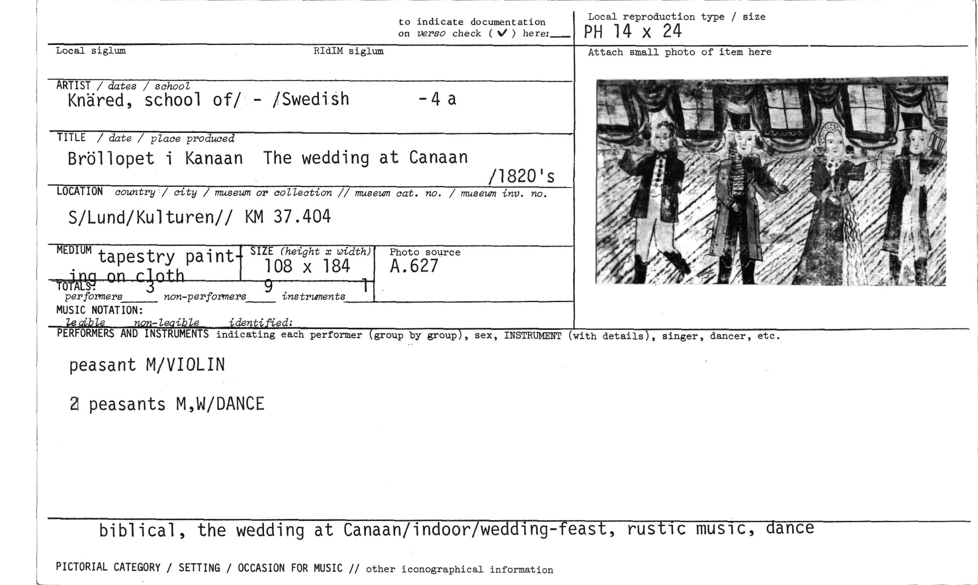 //// to indicate documentation //// on versa check ( ) here:_ //// Local reproduction type / size //// PH 14 x 24 //// Local siglum RIdIM siglum //// ARTIST / dates / school //// Knäred, school of/ - /Swedish -4 a //// TITLE / date / place produced //// Bröllopet i Kanaan The wedding at Canaan //// LOCATION country / city / museum or collection // museum cat. no. / museum inv. no. //// S/Lund/Kulturen// KM 37.404 //// Jag on r.pth //// MEDIUM SIZE (height x width) //// performers non-perfOrmers 9 instruments 1 //// tapestry paint- 108 x 184 //// /1820's //// Photo source //// A.627 //// Attach small photo of item here //// MUSIC NOTATION: //// 4e4ible non-leaible identilUd: //// PERFORMERS AND INSTRUMENTS indicating each //// peasant M/VIOLIN //// 2 peasants M,W/DANCE //// performer (group by groupT, sex, INSTRUMENT (with details), singer, dancer, etc. //// biblical, the wedding at Canaan/indoor/wedding-feast, rustic music, dance //// PICTORIAL CATEGORY / SETTING / OCCASION FOR MUSIC // other iconographical information ////