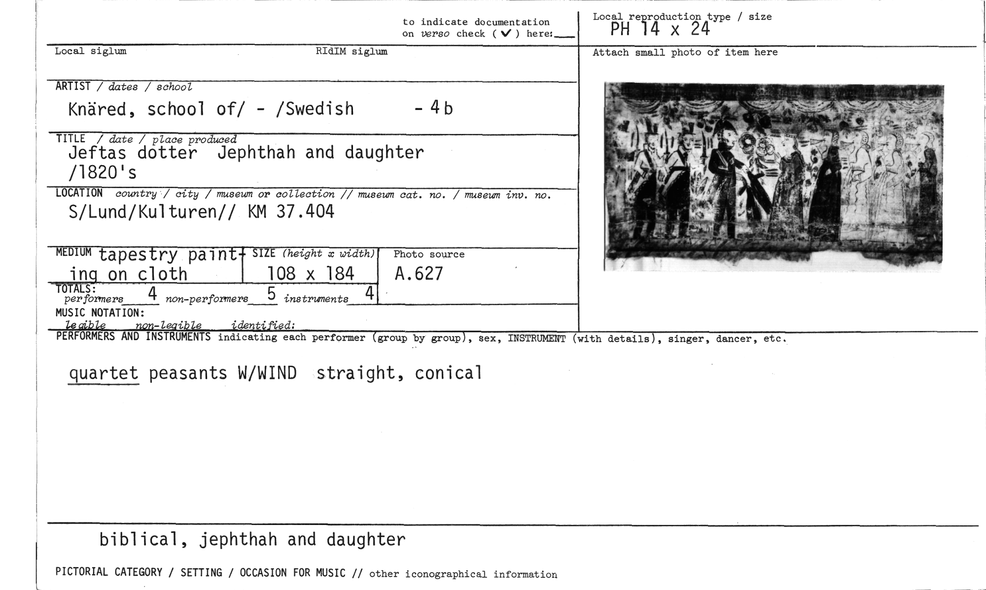 //// LocalH1 reproduction4 type / size //// P4 x //// to indicate documentation on verso check (N.1 ) //// Local siglum //// RIdIM siglum //// Attach small photo of item here //// ARTIST / dates / school //// Knäred, school of/ - /Swedish - 4b //// TITLE / date / place produced //// Jeftas dotter Jephthah and daughter /1820's //// LOCATION country / city / museum or collection // museum cat. no. / museum inv. no. //// S/Lund/Kulturen// KM 37.404 //// Photo source //// A.627 //// MUSIC NOTATION: //// lecible non-leaible identified: //// PERFORMERS AND INSTRUMENTS indicating each //// performer Cgroup by group), sex, INSTRUMENT (with details), singer, dancer, etc. //// quartet peasants W/WIND straight, conical //// biblical, jephthah and daughter //// PICTORIAL CATEGORY / SETTING / OCCASION FOR MUSIC // other iconographical information //// MEDIUM tapestry paint- SIZE (height x width) //// ing on cloth 108 x 184 //// TOTALS: //// perfbrmers 4 non-perfOrmers 5 instruments 4 ////