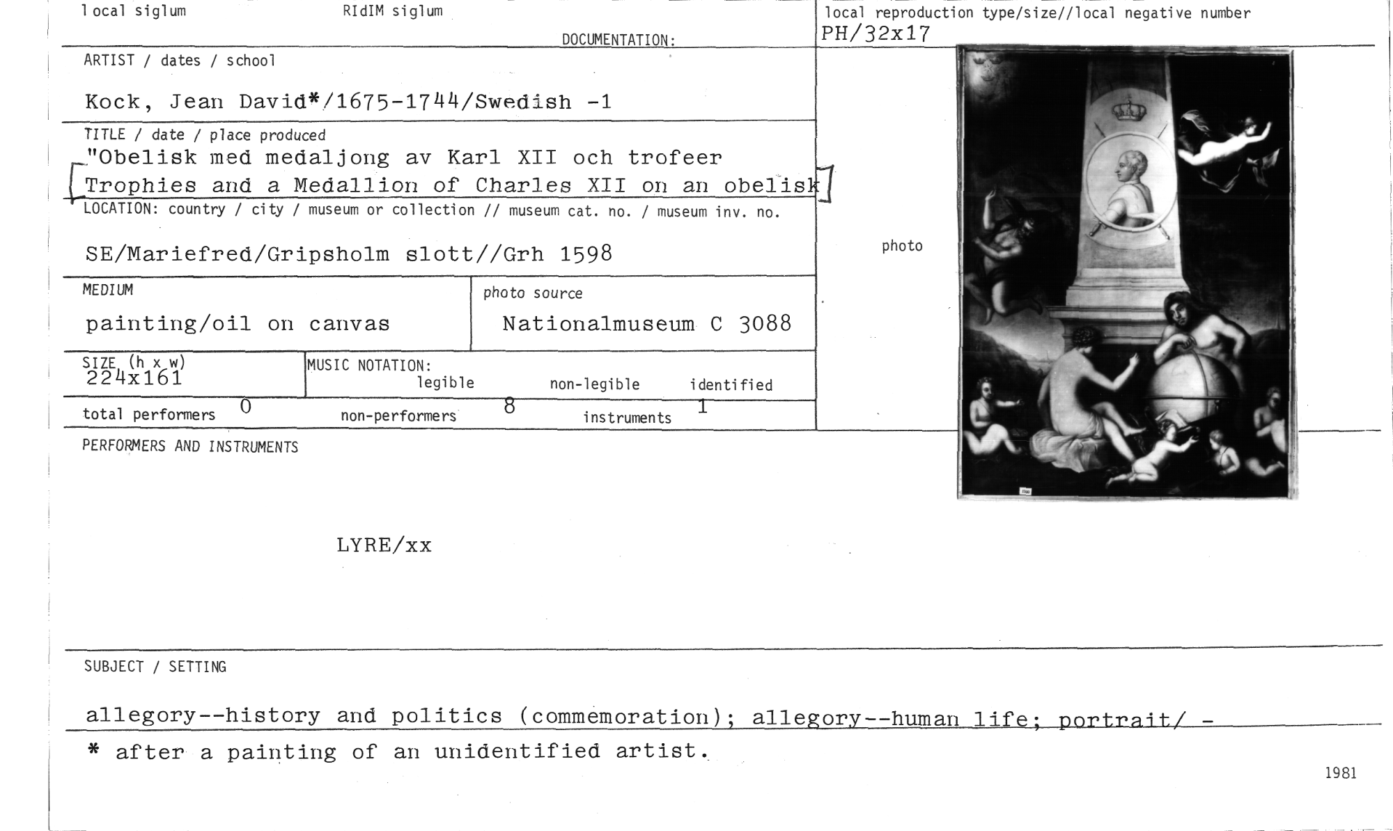 //// 1 ocal siglum RIdIM siglum //// DOCUMENTATION• //// ARTIST / dates / school //// Kock, Jean David*/1675-1744/Swedish -1 //// TITLE / date / place produced //// "Obelisk med medaljong av Karl XII och trofeer fTrophies and a Medallion of Charles XII or an obelis //// LOCATION: country / city / museum or collection // museum cat. no. / museum inv. no. //// SE/Mariefred/Gripsholm slott//Grh 1598 //// 1 //// total performers non-performers instruments //// PERFORMERS AND INSTRUMENTS local reproduction type/size//local negative number //// PH/32x17 //// MEDIUM //// painting/oil on canvas //// photo source //// Nationalmuseum C 3088 //// SIZE (h x w) //// 224x161 //// MUSIC NOTATION: //// legible //// non-legible i denti fi ed //// LYRE/xx //// SUBJECT / SETTING //// allegory--history and politics (commemoration); allegory--human life; portrit/ - * after a painting of an unidentified artist, //// 1981 ////