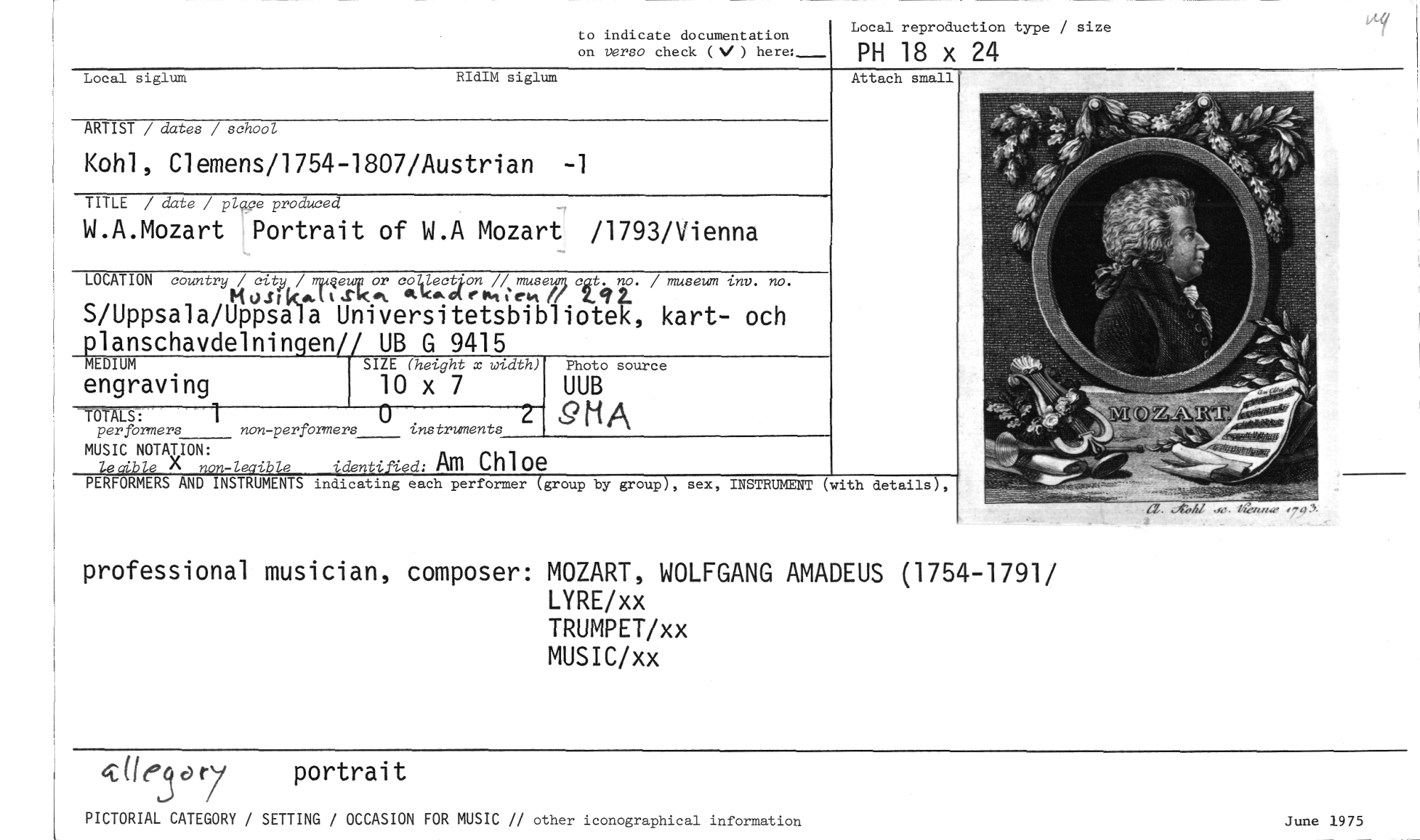 //// to indicate documentation on versa check ( ) here: //// Local reproduction type / size //// PH 18 x 24 //// Local siglum RIdIM siglum //// ARTIST / dates / school //// Kohl, Clemens/1754-1807/Austrian -1 //// TITLE / date / place produced //// W.A.Mozart Portrait of W.A Mozart /1793/Vienna //// S/Uppsala/Uppsäla Universitetsbibliotek', kart- och //// LOCATION country / city / mKeuf or co4lecti.on / museum inv. no. //// hikMtkilkilJr1C" 10(0-41,41'114 //// planschavdelningen _/ UB G 9415 //// MEDIUM SIZE (height x width) Photo source //// engraving 10 x 7 UUB //// 91-IA //// TOTALS: 1 0 2 //// per formers non-perfbrmers instruments //// MUSIC NOTATION: //// lecible X non-leaible identified: Am Chl oe //// PERFORMERS AND INSTRUMENTS indicating each performer (group by group), sex, INSTRUMENT //// Attach small //// ith details), //// professional musician, composer: MOZART, WOLFGANG AMADEUS (1754-1791/ //// LYRE/xx //// TRUMPET/xx //// MUSIC/xx //// (te.jc)ry portrait //// PICTORIAL CATEGORY / SETTING / OCCASION FOR MUSIC // other iconographical information //// June 1975 ////