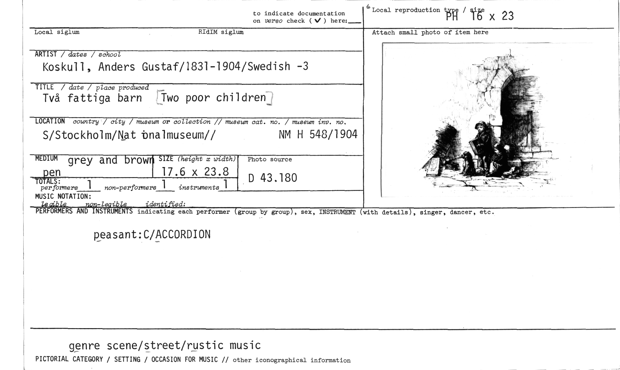 //// to indicate documentation on versa check (V ) //// Local reproduction Isu //// inex 23 //// Attach small photo of item here //// RIdIM siglum //// Local siglum //// ARTIST / dates / school //// Koskull, Anders Gustaf/1831-1904/Swedish -3 //// TITLE / date / place produced //// Två fattiga barn Two poor children //// LOCATION country / city / museum or collection // museum cat. no. / museum inv. no. //// Photo source //// D 43.180 //// MEDIUM grey and brown //// Den //// per formers 1 //// non-perfbrmers 1 instruments 1 //// SIZE (height x width) //// 17.6 x 23.8 //// S/Stockholm/Nat analmuseum// NM H 548/1904 //// MUSIC NOTATION: //// non-leaible identified; //// PERFORMERS AND INSTRUMENTS indicating each performer //// peasant:C/ACCORDION //// (group by group), sex, INSTRUMENT (with details), singer, dancer, etc. //// genre scene/street/rustic music //// PICTORIAL CATEGORY / SETTING / OCCASION FOR MUSIC // other iconographical information ////
