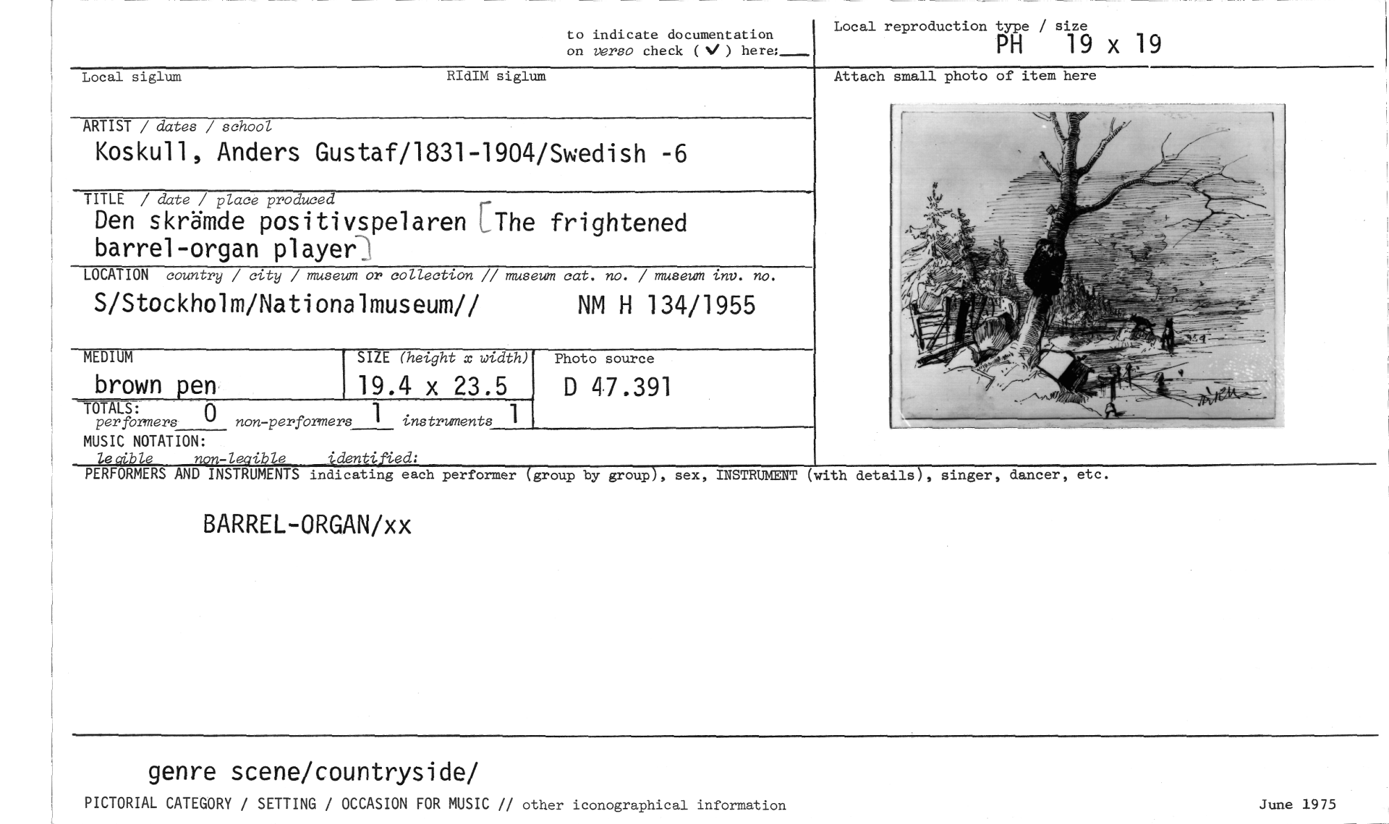 //// to indicate documentation on versa check (V ) here: //// Local reproduction type / size //// PH 19 x 19 //// Local siglum RIdIM siglum //// ARTIST / dates / school //// Koskull, Anders Gustaf/1831-1904/Swedish -6 //// TITLE / date / place produced //// Den skrämde positivspelaren LThe frightened barrel-organ player) //// LOCATION country / city / museum or collection // museum cat. no. / museum inv. no. //// S/Stockholm/Nationalmuseum// NM H 134/1955 //// Photo source //// D 47.391 //// TOTALS: //// 0 //// performers non-performers 1 instruments 1 Attach small photo of item here //// MEDIUM //// brown pen //// SIZE (height x width) //// 19.4 x 23 5 //// MUSIC NOTATION: //// non-leaible //// PERFORMERS AND INSTRUMENTS //// identified: //// indicating each performer (group by group), sex, INSTRUMENT (with detailsY, singer, dancer, etc. //// BARREL-ORGAN/xx //// genre scene/countryside/ //// PICTORIAL CATEGORY / SETTING / OCCASION FOR MUSIC // other iconographical information June 1975 ////