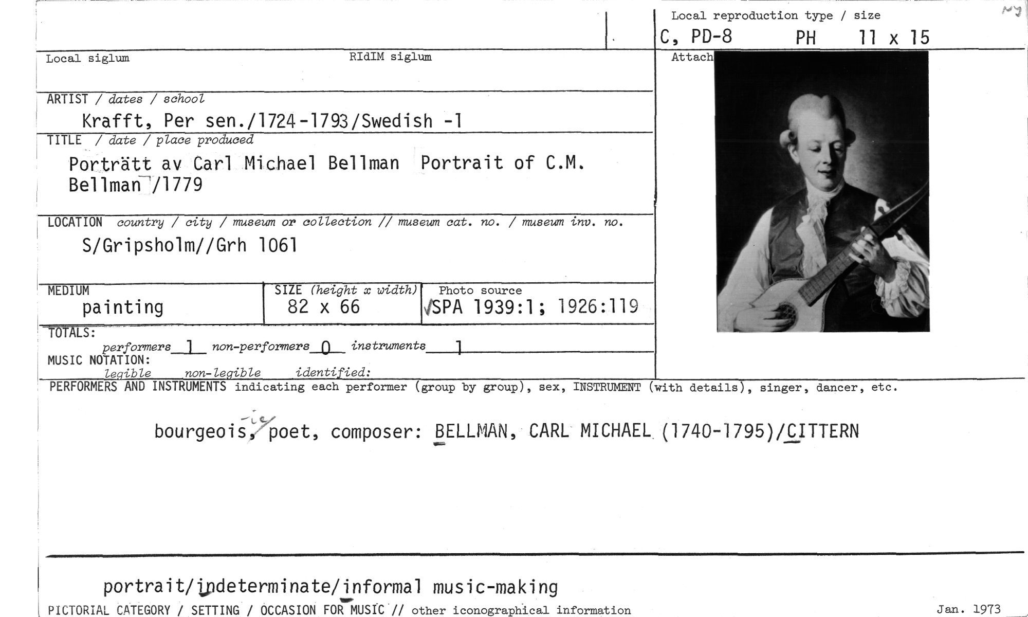 //// portraititipdeterminatOinformal music-making //// PICTORIAL CATEGORY / SETTING / OCCASION FOR MUSIC // other iconographical information //// Jan. 1973 //// Photo source //// MEDIUM SIZE (height x width) //// painting 82 x 66 //// TOT S: performers_j__ non-performers_11_ instruments MUSIC NOTATION: //// legible non-legible identified: //// 6PA 1939:1; 1926:119 //// Local reproduction type / size //// , PD-8 PH 11 x 15 //// Local siglum RIdIM siglum //// ARTIST / dates / school //// Krafft, Per sen./1724-1793/Swedish -1 //// TITLE / date / place produced //// Porträtt av Carl Michael Bellman Portrait of C.M. Bellman-71779 //// LOCATION country / city / museum or collection // museum cat. no. / museum 1.nv. no. //// S/Gripsholm//Grh 1061 //// PERFORMERS AND INSTRUMENTS indicating each performer (group by //// group), sex, INSTRUMENT (with details), singer, dancer, etc. //// bourgeois,'poet, composer: BELLMAN, CARL MICHAEL (1740-1795)/CITTERN //// Attach //// 1 ////