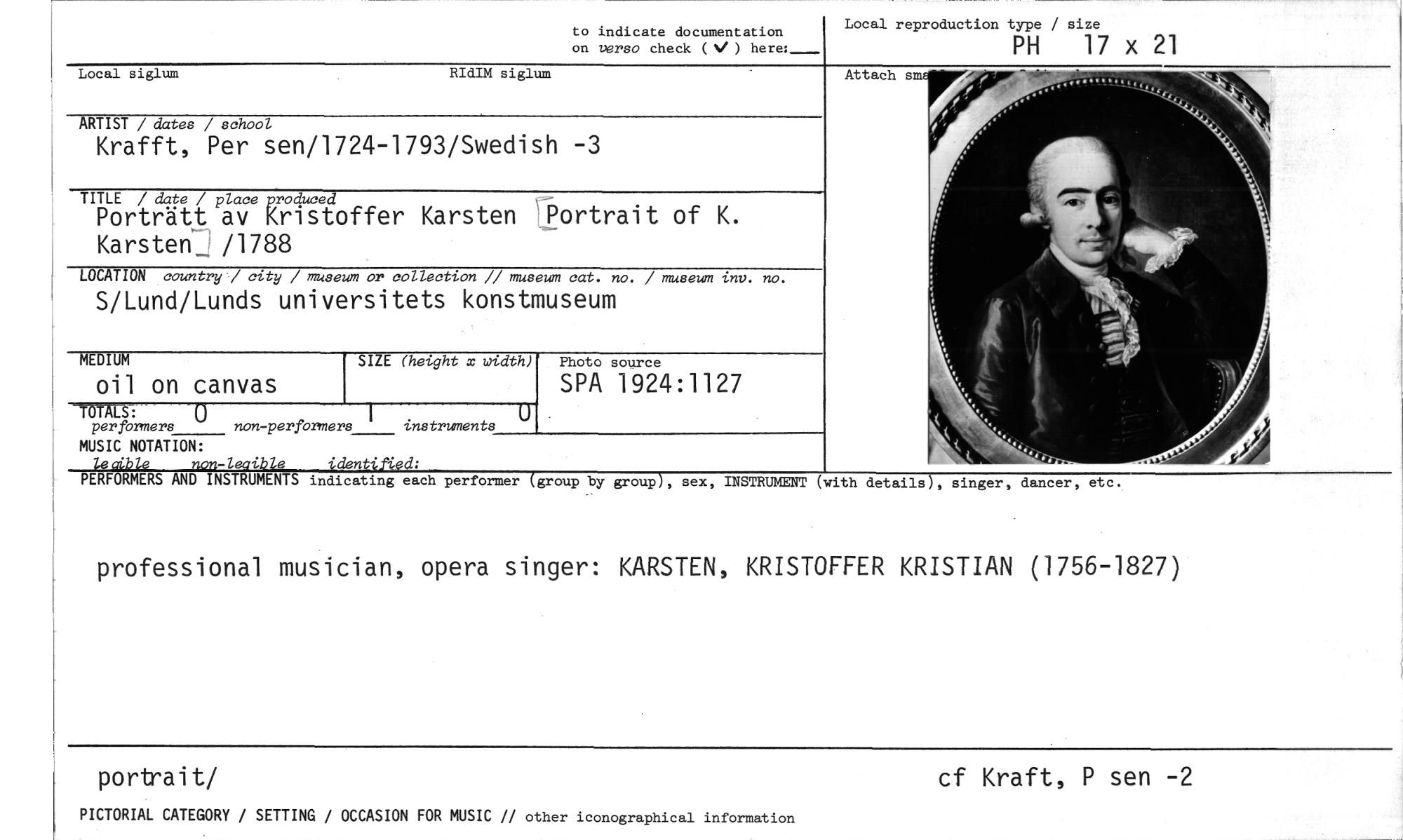 //// to indicate documentation on versa check (V ) here: //// Local reproduction type / size //// PH 17 x 21 //// Local siglum RIdIM siglum //// Attach sm //// ARTIST / datos / school //// Krafft, Per sen/1724-1793/Swedish -3 //// TITLE / date / place pmcPwed ,- //// Portrått av kristoffer Karsten Portrait of K. KarsterL /1788 //// LOCATION country / city / museum or collection // museum cat. no. / museum .inv. no. //// S/Lund/Lunds universitets konstmuseum //// MEDIUM //// oil on canvas //// Photo source //// SIZE (height x width) //// SPA 1924:1127 //// TÖTALS: //// per formers non-perfbrmers i instruments //// MUSIC NOTATION: //// leaible non-leaible identified: //// PERFORMERS AND INSTRUMENTS indicating each performer (group by group), sex, INSTRUMENT (with details), singer, dancer, etc. //// • //// professional musician, opera singer: KARSTEN, KRISTOFFER KRISTIAN (1756-1827) //// portrait/ //// cf Kraft, P sen -2 //// PICTORIAL CATEGORY / SETTING / OCCASION FOR MUSIC // other iconographical information ////