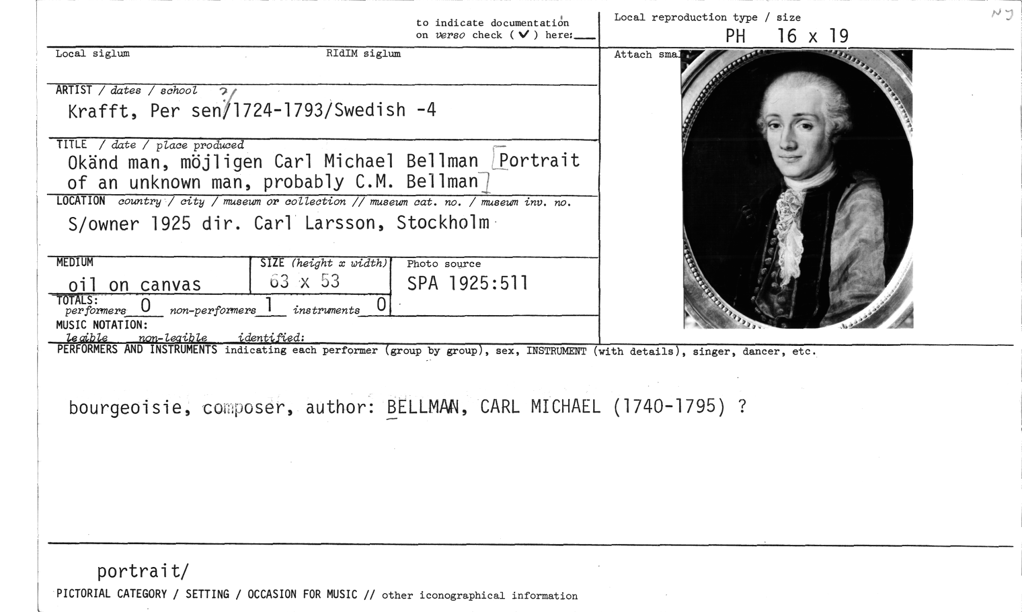 //// to indicate documentatiön //// on verso check (V ) here: //// Local siglum RIdIM siglum //// Local reproduction type / size //// PH 16 x 19 //// Attach sma //// ARTIST / dates / school 9,t //// Krafft, Per sed/1724-1793/Swedish -4 //// TITLE / date / place produced //// Okänd man, möjligen Carl Michael Bellman Portrait of an unknown man, probably C.M. Bellman'? //// LOCATION country / city / museum or collection // museum cat. no. / museum inv. no. //// S/owner 1925 dir. Carl Larsson, Stockholm //// MEDIUM //// oil on canvas //// SIZE (height x width) //// 63 x53 //// Photo source //// SPA 1925:511 //// SALS: //// per formers n non -performers 1 instruments 0 //// MUSIC NOTATION: //// le aihle non-lecible identilUd: //// PERFORMERS AND INSTRUMENTS indicating each performer (group by group), sex, INSTRUMENT //// (with details), singer, dancer, etc. //// bourgeoisie, co2poser, author: BELLMAN, CARL MICHAEL (1740-1795) ? //// portrait/ //// PICTORIAL CATEGORY / SETTING / OCCASION FOR MUSIC // other iconographical information ////