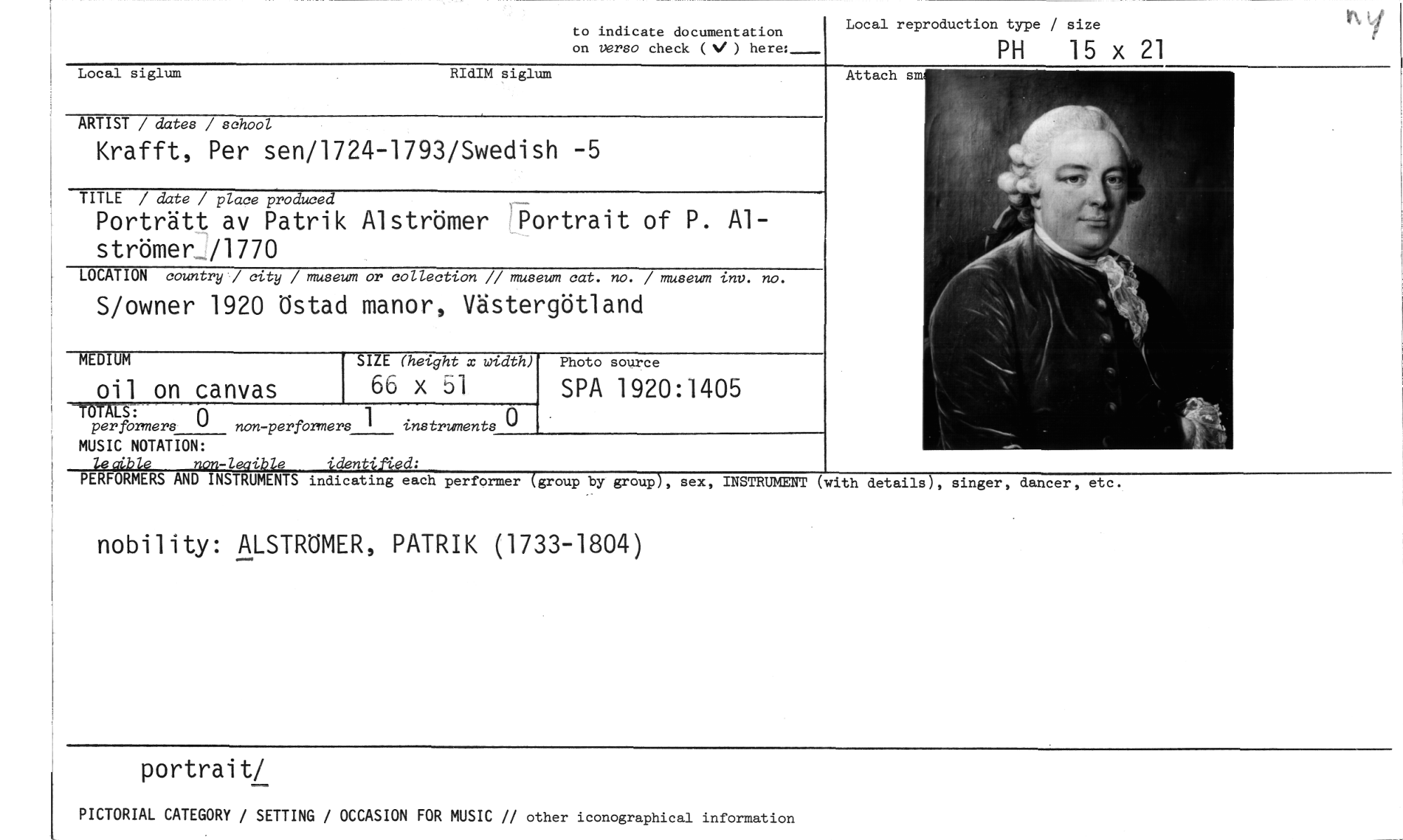 //// Local reproduction type / size //// to indicate documentation //// on verso check ( ) here:_ //// PH 15 x 21 //// Local siglum RIdIM siglum //// Attach s //// ARTIST / dates / school //// Krafft, Per sen/1724-1793/Swedish -5 //// TITLE / date / place produced //// Porträtt av Patrik Alströmer Portrait of P. Alströmer_/1770 //// LOCATION country / city / museum or collection // museum cat. no. / museum inv. no. //// S/owner 1920 Östad manor, Västergötland //// MEDIUM //// oil on canvas //// SIZE (height x width) Photo source //// 66 x 51 SPA 1920:1405 //// per formers 0 non-perfarmers 1 instruments MUSIC NOTATION: //// lecible nan-leaible identif4ed; //// PERFORMERS AND INSTRUMENTS indicating each perfornier (group by group), sex, INSTRUMENT (with details), singer, dancer, etc. //// nobility: ALSTRÖMER, PATRIK (1733-1804) //// portrai t/ //// PICTORIAL CATEGORY / SETTING / OCCASION FOR MUSIC // other iconographical information ////
