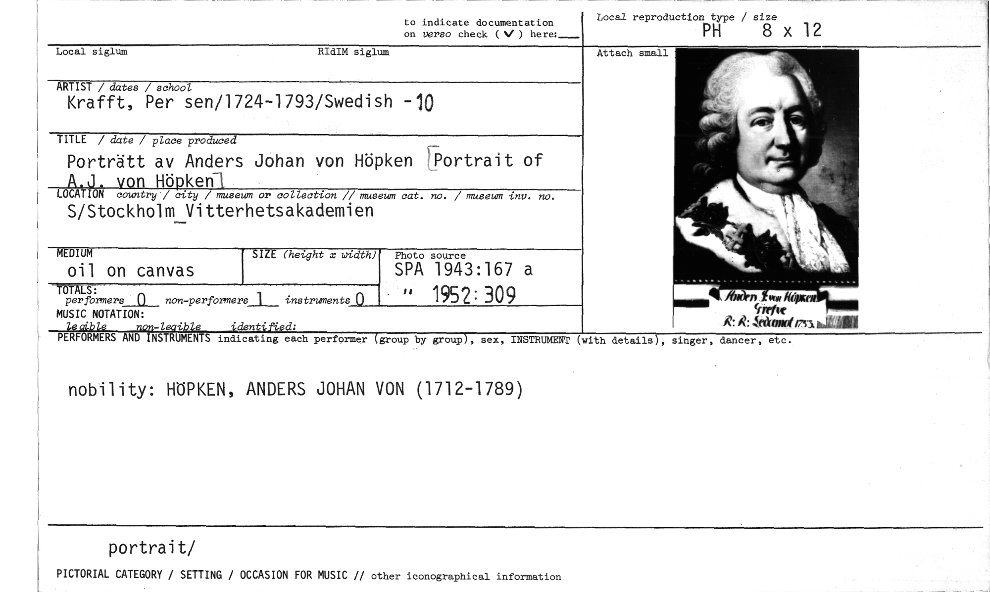 //// to indicate documentation Local reproduction type / size //// on verso check (V ) here:_ PH 8 X 12 //// Local siglum RIdIM siglum //// ARTIST / dates / school //// Krafft, Per sen/1724-1793/Swedish -10 //// TITLE / date / place produced //// Porträtt av Anders Johan von Höpken 'Portrait of A.d, von Höpken //// LOCATION country/ city / museum or collection // museum cat. no. / museum inv. no. //// S/Stockholm Vitterhetsakademien //// Attach small //// MEDIUM -- SIZE (height x width) //// oil on canvas ghPtik' sW4e3 :167 a //// TOTALS: " 1952: 309 kikn irw"mw //// per formers n non-perfOrmers 1 instruments //// MUSIC NOTATION: ttrelit //// lecible non-leaible identified; :R: IZ : Jetiond 13.3. liktal //// PERFORMERS AND INSTRUMENTS indicating each performer (group by group), sex, INSTRUMENT (with details), singer, dancer, etc. //// nobility: HÖPKEN, ANDERS JOHAN VON (1712-1789) //// portrait/ //// PICTORIAL CATEGORY / SETTING / OCCASION FOR MUSIC // other iconographical information ////