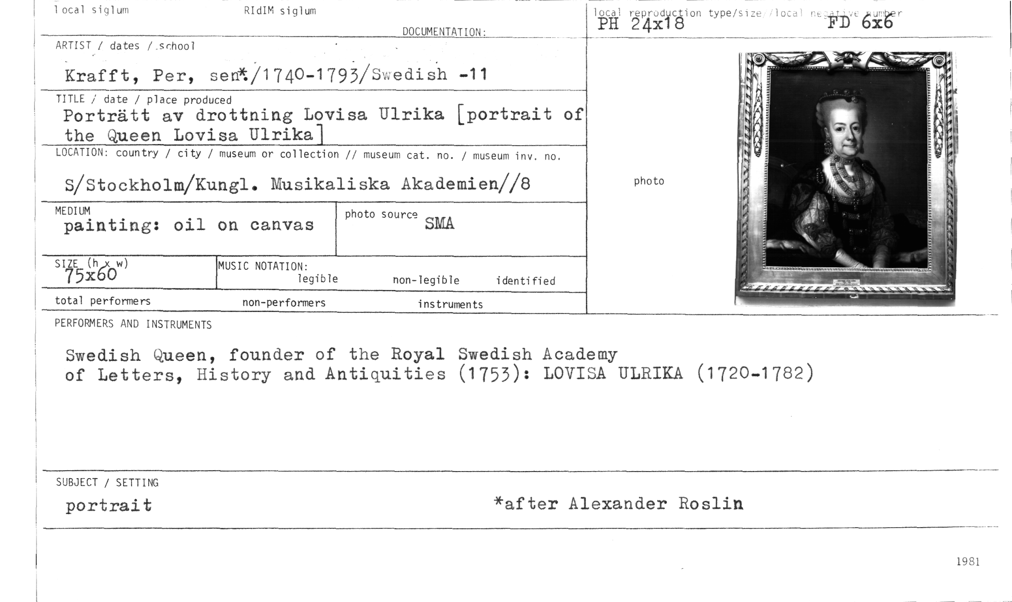 //// 19E1 //// non-performers instruments //// total performers //// MUSIC NOTATION: //// legible //// non-legible identified //// SUBJECT / SETTING //// portrait //// *af ter Alexander Roslin //// lotal siglum RIdIM siglum //// DOCUMENTATION. //// ARTIST/ dates /.school //// Krafft, Per, sent/1740-1793/Swedish -11 //// TITLE / date / place produced //// Porträtt av drottning Lovisa Ulrika [portrait of //// the Queen Lovisa Ulrika] //// LOCATION: country / city / museum or collection // museum cat. no. / museum inv. no. //// S/Stockholm/Kungl. Musikaliska Akademien//8 //// photo source //// SMA //// S Abw //// MEDIUM //// painting: oil on canvas //// PERFORMERS AND INSTRUMENTS //// Swedish Queen, founder of the Royal Swedish Academy //// of Letters, History and Antiquities (1753): LOVISA ULRIKA (1720-1782) //// lotal reprodpction type/size //// PH 24x18 //// photo ////
