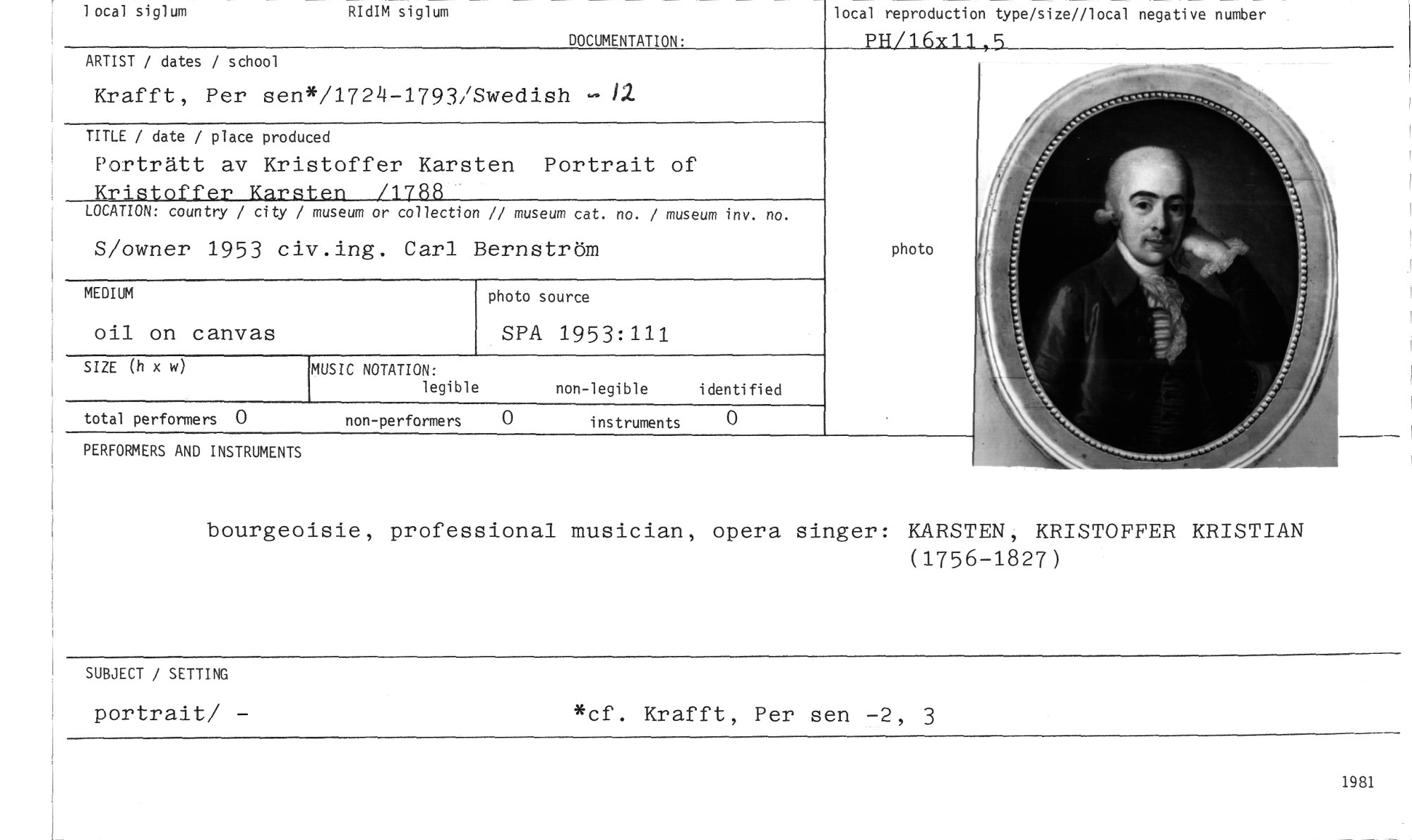 //// 0 //// TITLE / date / place produ ed //// Porträtt av Kristoffer Karsten Portrait of Kristoffer Karsten /1788 //// LOCATION: country / city / museum or collection // museum cat. no. / museum inv. no. //// 1 ocal siglum R dIM siglum //// DOCUMENTATION. //// ARTIST / dates / school //// Krafft, Per sen */1724-1793/Swedish -12 //// S/owner 1953 ci v.ing. Carl Bernström //// MEDIUM photo source //// oil on canvas SPA 1953:111 //// SIZE (h x w) //// total performers 0 non-performers 0 instruments //// PERFORMERS AND INSTRUMENTS local reproduction type/size//local negative number //// PH/16x11,5 //// ( //// MUSIC NOTATION: //// legible non-legible identified //// photo //// bourgeoisie, professional musician, opera singer: KARSTEN, KRISTOFFER KRISTIAN //// (1756-1827) //// SUBJECT / SETTING *cf. Krafft, Per sen -2, 3 //// portrait/ - //// 1981 ////