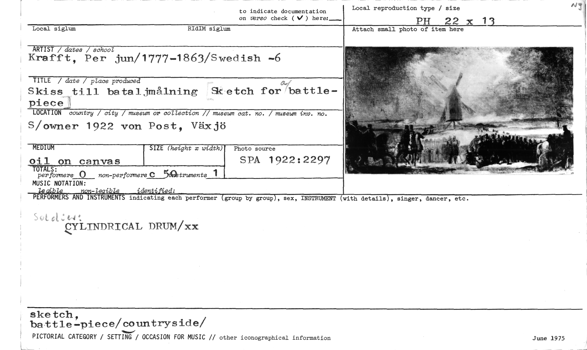 //// sketch, battle-piece/countryside/ //// PICTORIAL CATEGORY / SETTING / OCCASION FOR MUSIC // other iconographical information //// June 1975 //// Photo source //// SPA 1922:2297 //// MEDIUM //// SIZE (height x width) //// oil on canvas //// to indicate documentation //// on verso check ( ) here: //// RIdIM siglum //// Local reproduction type / size //// PH 22 x 13 //// Attach small photo of item here //// 1 Local siglum //// ARTIST / datas / school //// Krafft, Per jun/1777-1863/Swedish -6 //// TITLE / date / place produced //// Skiss till bataljmålning Sketch for battlepiece\ //// LOCATION country / city / museum or collection // museum cat. no. / museum tnv. no. //// S/owner 1922 von Post, Växjö //// T 0 T NES : //// per formers O non-performers C 5truments 1 //// MUSIC NOTATION: //// leaible non-lecible identkfied: //// PERFORMERS AND INSTRUMENTS indicating each performer-(group by group), //// S //// ZYLINDRICAL DRUM/xx //// sex, INSTRUMENT (with details), singer, dancer, etc. ////