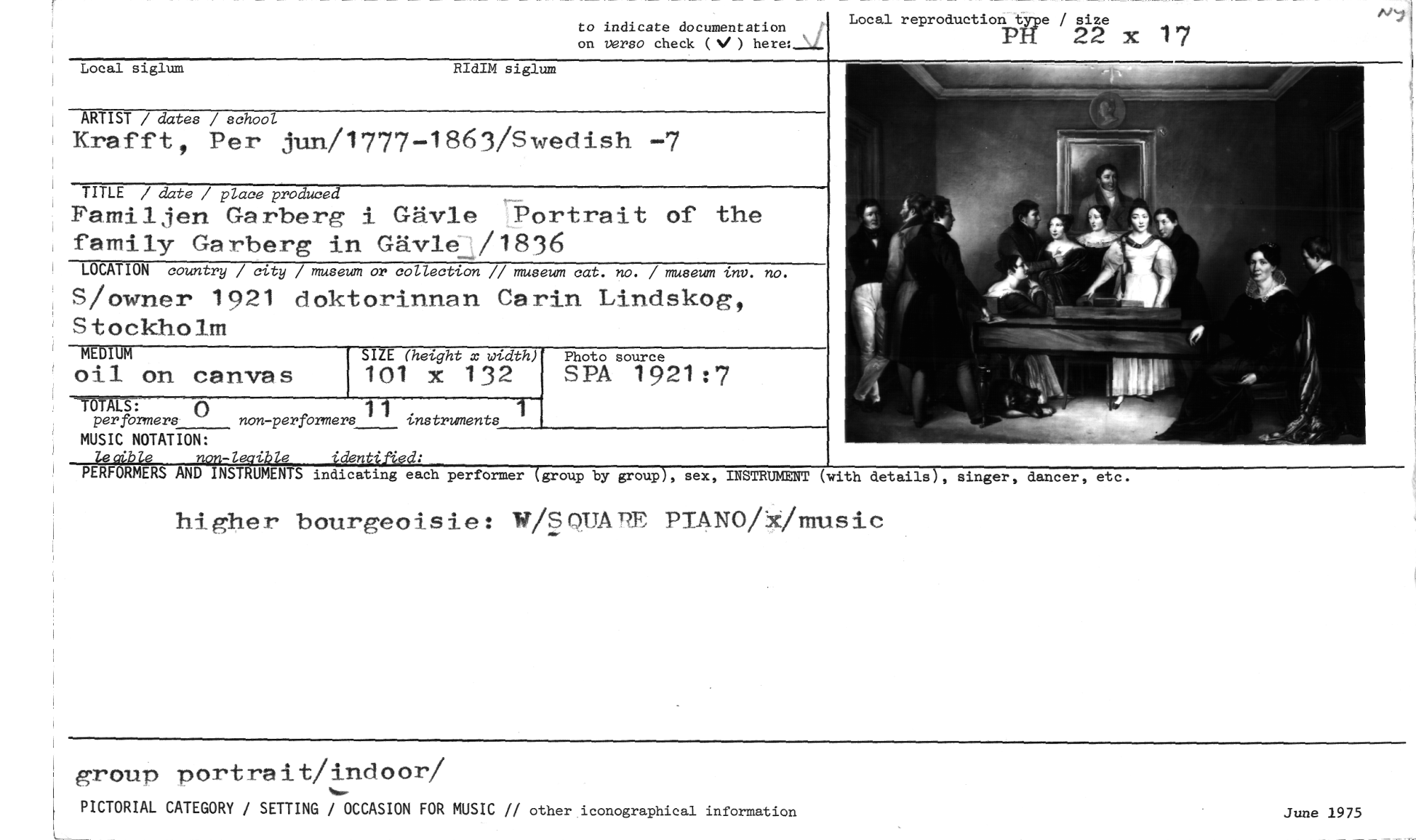 //// to indicate documentation on verso check (N/ ) //// Local reproduction type / size //// PI 22 x 17 //// ' //// Local siglum RIdIM siglum //// ARTIST / dates / school //// Krafft, Per jun/1777-1863/Swedish -7 //// TITLE / date / place produced //// Familjen Garberg i Gävle Portrait of the family Garberg in Gävle /1836 //// LOCATION country / city / museum or collection // museum cat. no. / museum inv. no. //// S/owner 1921 doktorinnan Carin Lindskog, Stockholm //// MEDIUM SIZE (height x width) Photo source //// oil on canvas 101 x 132 SPA 1921:7 //// TÖTÄLS: () non-per formers 11 instruments 1 //// per formers //// MUSIC NOTATION: //// PERF A, 1-•ip e 'den //// MERS AND INST UMENTS indicating each per former group by group , sex, INSTRUMENT (with details , singer, dancer, etc. //// higher bourgeoisie: WiSQUATT PIANO/k/music //// //// group portrait/indoor/ //// PICTORIAL CATEGORY / SETTING / OCCASION FOR MUSIC // other iconographical information //// June 1975 ////