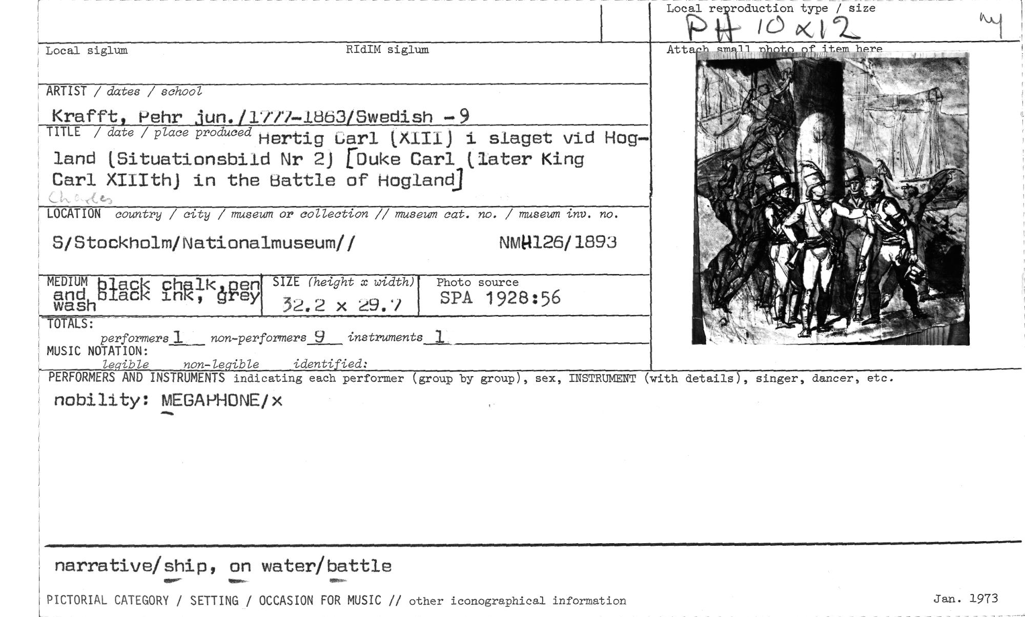 //// J Local siglum RIdIM siglum //// Local re oduction type / size \1::› iö //// Att. 'tam here //// ARTIST / dates / school //// Krafft, Pehr jun./17/7-1863/Swedish -9 TITLE / date / place produced Hertig Carl 1X1II) i slaget vid Hem- //// land (Situationsbild Nr 2) Duke Carl (later King Carl XIIIth) in the Battle of Hemland.] //// LOCATION country / city / museum or collection // museum cat. no. / museum inv. no. //// S/Stockholm/Nationalmuseum// NMk126/1893 //// MEDIUM black SIZE (height x width) Photo source //// nd inN, H 32.2 x 29.7 SPA 1928:56 //// chglk4859 //// a //// wash Lao //// //// TOTALS: //// performers 1 non -performers 9 instruments_i_ //// MUSIC NOTATION: //// Ze.ible non-Le ible identi ied: //// r PERFORMERS AND INSTRUMENTS indicating each performer (group by group), sex, INSTRUMENT //// nobility: MEGAPHONE/x //// ith details), singer, dancer, etc. //// narrative/ship, on water/battle //// PICTORIAL CATEGORY / SETTING / OCCASION FOR MUSIC // other iconographical information //// Jan. 1973 ////