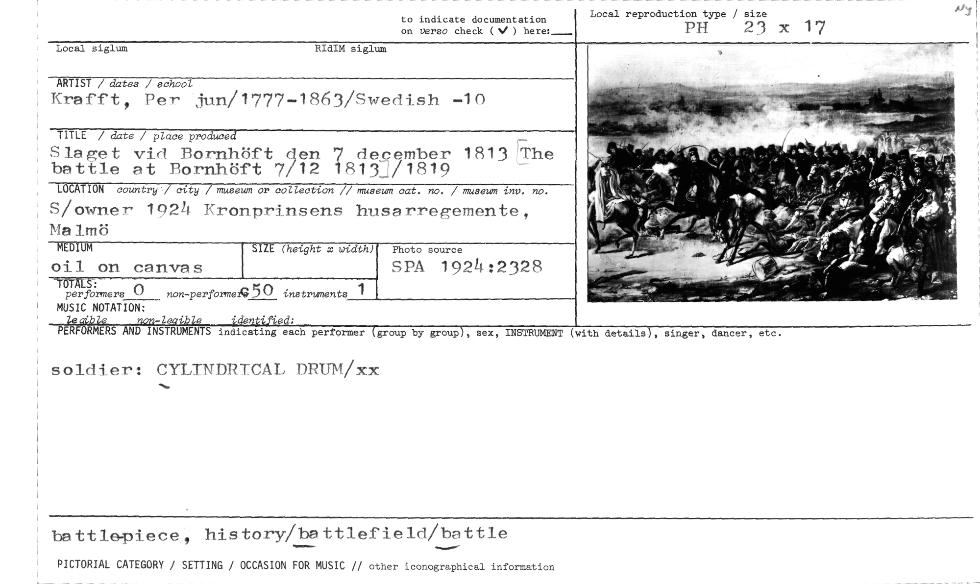 //// to indicate documentation //// on versa check (N/ ) here:_ //// Local reproduction type / size //// PH 23 x 17 //// Local siglum RIdIM siglum //// ARTIST / dates / school //// Krafft, Per jun/1777-1863/Swedish -10 //// TITLE / date / place produced //// Slaget vid Bornhöft gen 7 december 1813 The battle at Bornhöft 7/12 18137/1819 //// LOCATION country / city / museum or collection // museum cat. no. / museum inv. no. //// S/owner 1924 Kronprinsens husarregemente, Malmö //// Photo source //// SPA 1924:2328 //// -Tums: //// per formers () non-perfermeR5() instruments //// MUSIC NOTATION: //// leaible non-leaible identified: //// PERFORMERS AND INSTRUMENTS indicating each performer (group by group), sex, INSTRUMENT (with details), ringer, dancer, etc. //// soldier: CYLINDRTCAL DRUM/xx //// MEDIUM //// oil on canvas //// SIZE (hetght x width) //// battle-piece, history/battlefield/battle //// PICTORIAL CATEGORY / SETTING / OCCASION FOR MUSIC // other iconographical information ////