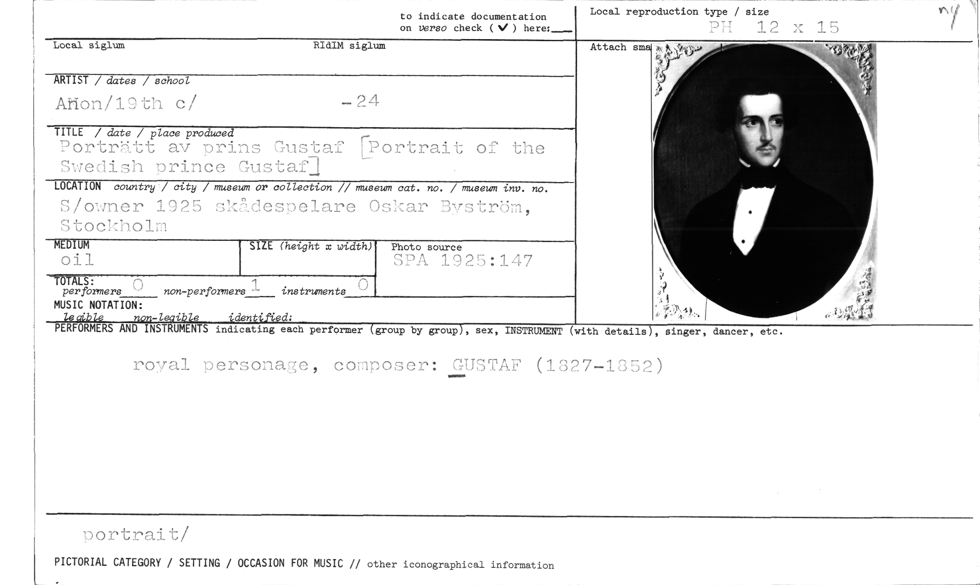 //// to indicate documentation //// on verso check (%, ) here:_ //// Local reproduction type / size //// ?H 12 x 15 //// Local siglum //// ARTIST / datee / school //// Ation/19th c/ //// Attachs //// EIdIM siglum //// - 24 //// TITLE / date / place produced //// Porträtt av prins Gustaf [Portrait of the Swedish prince Gustaf] //// LOCATION country'/ city / museum or collection // museum cat. no. / museum ulv. no. //// S/owner 1925 sk,11desuelare Oskar Bvstrdm, StockhoL:1 //// MEDIUM //// 011 //// SIZE (height x width) //// hcto source //// SPA 192 :147 //// d //// TOTALS: //// per formers non-perfbrmers - instruments 9, //// MUSIC NOTATION: ...)',.51 //// leaible non-leaible identifried; //// PERFORMERS AND INSTRUMENTS indicatingeachperformer (group by group-Y, sex, INSTRUMENT (with details), singer, dancer, etc. //// royal personage, composer: GUSTAF (1827-1852) //// nortrait/ //// PICTORIAL CATEGORY / SETTING / OCCASION FOR MUSIC // other iconographical information ////