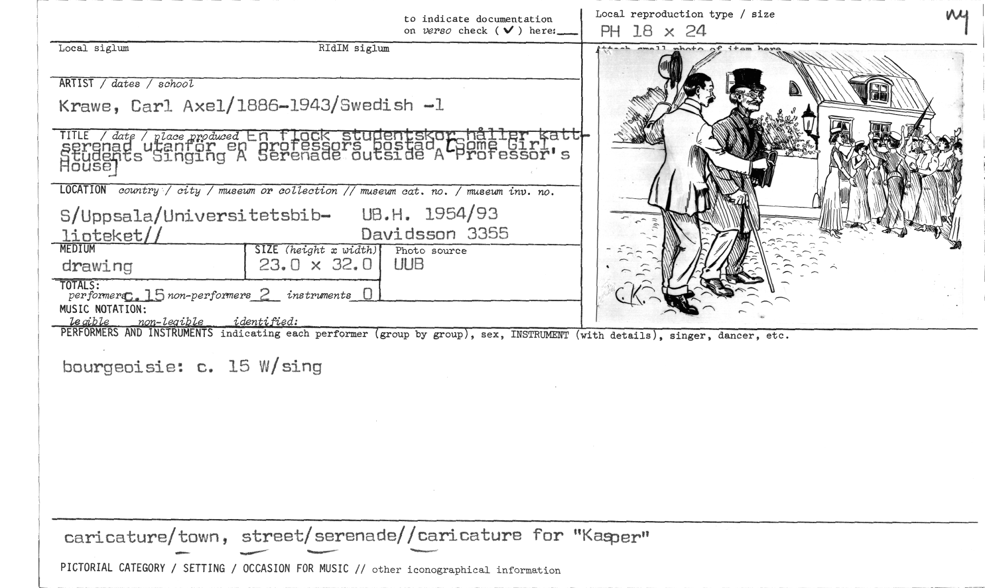 //// Local reproduction type / size //// PH 18 x 24 //// to indicate documentation //// on versa check ( %, ) here:___ //// Local siglum RIdIM siglum //// ARTIST / dates / school //// Krawe, Carl Axel/1886-1943/Swedish —1 TITLE/da—/pcgcelynoduceeg En änsk0-å4'u //// å f PIRYTOTHYV.tt, //// REW //// suåtRafig R gErenaue ou si e A ro essor's //// LOCATION country / city / museum or collection // museum cat. no. / museum int,. no. //// S/Uppsala/Universitetsbib— UB.H. 1954/93 lioteket// Davidsson 3355 //// MEDIUM SIZE (height x width) Photo source //// drawing 23.0 x 32.0 UUB //// OTAd: //// perfortnerej3non-performers_2_ instruments //// MUSIC NOTATION: //// non-legible identifiod: //// PE'FORMERS AND INSTRUMENTS indicating each performer (group by group), sex, INSTRUMENT (with details), singer, dancer, etc. //// bourgeoisie: c. 15 W/sing //// caricature/town, street/serenade//caricature for "Kaffer" //// PICTORIAL CATEGORY / SETTING / OCCASION FOR MUSIC // other iconographical information //// 0 ////