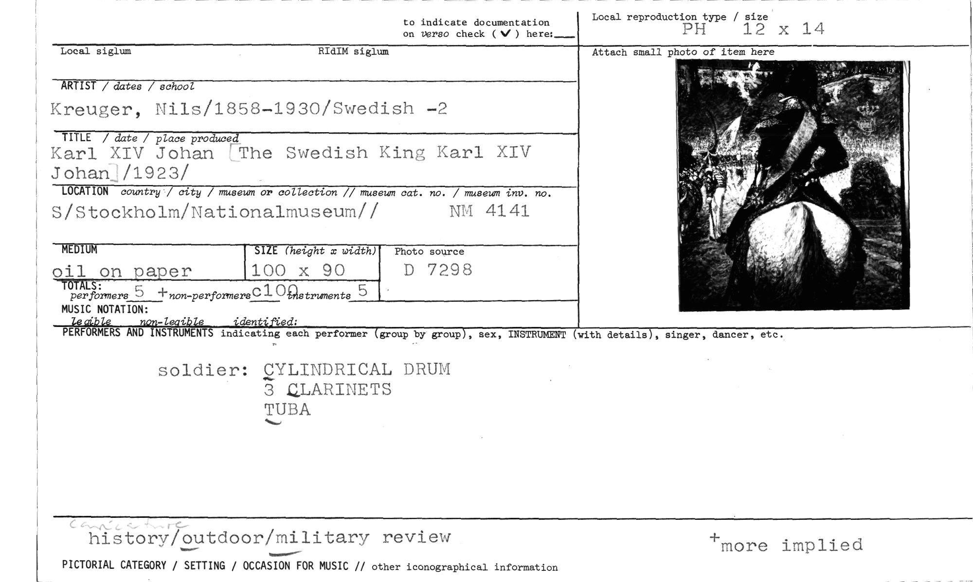 //// to indicate documentation Local reproduction type / size //// on verso check (V) here:--- PH 12 X 14 //// Local siglum RIdIM siglum //// Attach small photo of item here //// ARTIST / dates / school //// Kreuger, Nils/1858-1930/Swedish -2 //// TITLE / date / place produced //// Karl XIV Johan !The Swedish King Karl XIV Johan)/1923/ //// LOCATION country / city / museum or collection // museum cat. no. / museum inv. no. //// S/Stockholm/Nationalmuseum// NT1 4141 //// MEDIUM //// oil on payer //// —MWS'5 c10alstm,~85 //// per formers 'non-performers //// MUSIC NOTATION: //// PIPthigh AND INSTRUMENTS indicatiag each performer (group by group), sex, //// non-lgcibie identified: //// INSTRUMENT (with details), singer, dancer, //// soldier: CYLINDRICAL DRUM 3 ZLARINETS //// TUBA //// history/outdoor/military review +more implied //// PICTORIAL CATEGORY / SETTING / OCCASION FOR MUSIC // other iconographical information //// SIZE (height x width) //// 100 x 90 //// Photo source //// D 7298 //// etc. ////
