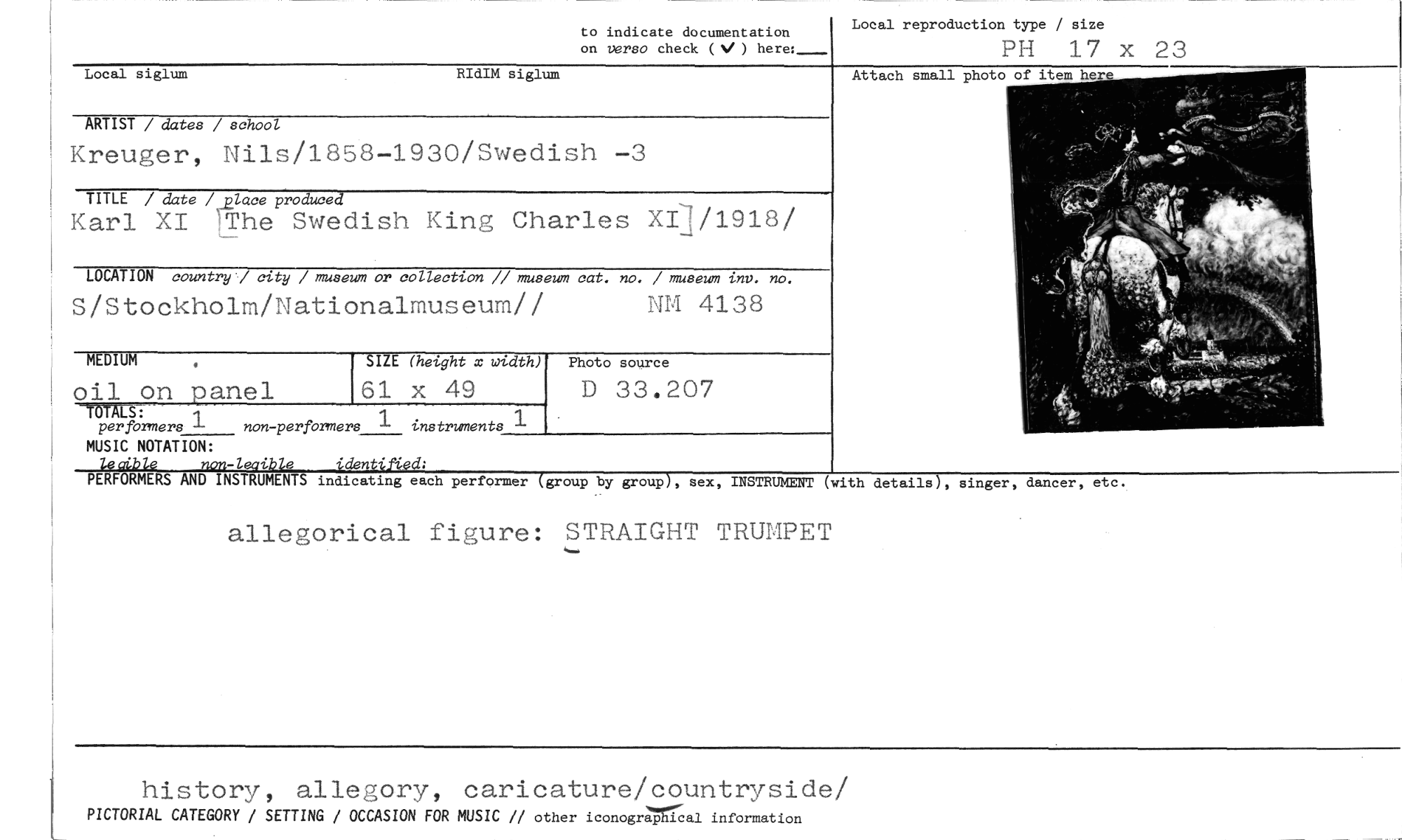 //// Local reproduction type / size //// PH 17 x 23 //// Attach small photo of //// to indicate documentation //// on verso check (V ) here:_ //// Local siglum RIdIM siglum //// ARTIST / dates / school //// Kreuger, Nils/1858-1930/Swedish -3 //// TITLE / date /2/ace produced //// Karl XI LThe Swedish King Charles XI]/1918/ //// LOCATION country / city / museum or collection // museum cat. no. / museum tnv. no. //// S/Stockholm/Nationalmuseum// NI4 4138 //// Photo source //// D 33.207 //// non-perförmers 1 instruments //// indicating each performer(roup by group), sex, //// allegorical figure: STRAIGHT TRUMPET //// oil on panel 61 x 49 //// [=--- i //// per formers //// MUSIC NOTATION: //// letible non-leaible identified; //// PERFORMERS AND INSTRUMENTS //// MEDIUM SIZE (height x width) //// INSTRUMENT (with details), singer, dancer, etc. //// history, allegory, caricature/countryside/ //// PICTORIAL CATEGORY / SETTING / OCCASION FOR MUSIC // other iconogrE1757"Cal information ////