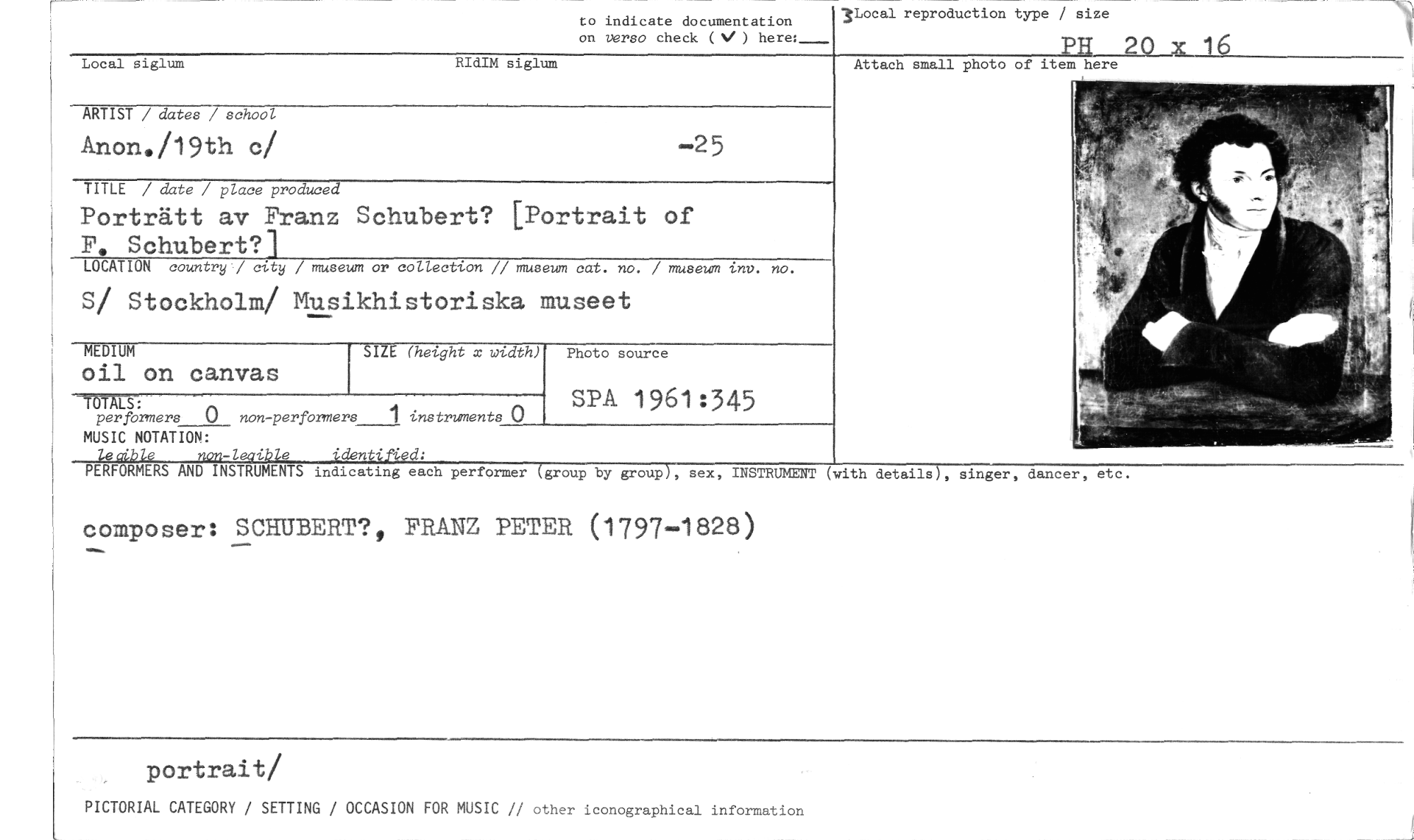 //// to indicate documentation on verso check ( V ) here: //// Local reproduction type / size //// PH 20 x 16 //// Attach small photo of item here //// Local siglum RIdIM siglum //// ARTIST / dates / school //// Anon./19th c/ —25 //// TITLE / date / place produced //// Porträtt av Franz Schubert? [Portrait of //// P. Schubert?"' //// LOCATION country / city / museum or collection // museum cat. no. / museum inv. no. //// S/ Stockholm/ Musikhistoriska museet //// SIZE (height x width) Photo source //// SPA 1961:345 //// MUSIC NOTATION: //// le alble non-leaible identified: //// PERFORMERS AND INSTRUMENTS //// composer: SCHUBERT?, FRANZ PETER (1797-1828) //// MEDIUM //// oil on canvas //// TOT S: //// per formers 0 non-performers 1 instruments 0 //// indicating each performer (group by group), sex, INSTRUMENT (with details), singer, dancer, etc. //// portrait/ //// PICTORIAL CATEGORY / SETTING / OCCASION FOR MUSIC // other iconographical information ////