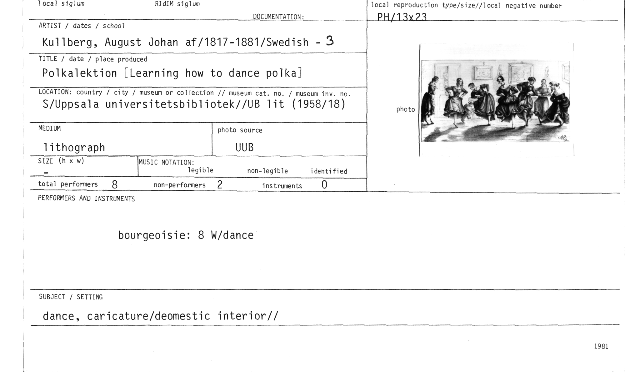//// local siglum RIdIM siglum //// DOCUMENTATION: //// local reproduction type/size//local negative number //// PH/13x23 //// ARTIST / dates / school //// Kullberg, August Johan af/1817-1881/Swedish - 3 //// TITLE / date / place produced //// Polkalektion nearning how to dance polka] //// LOCATION: country / city / museum or collection // museum cat. no. / museum inv. no. //// S/Uppsala universitetsbibliotek//UB lit (1958/18) //// MEDIUM //// lithograph //// photo source //// UUB //// photo //// MUSIC NOTATION: //// legible //// non-legible identified //// SIZE (h x w) //// total performers 8 non-performers 2 instruments 0 //// PERFORMERS AND INSTRUMENTS //// bourgeoisie: 8 W/dance //// SUBJECT / SETTING //// dance, caricature/deomestic interior// //// 1981 ////