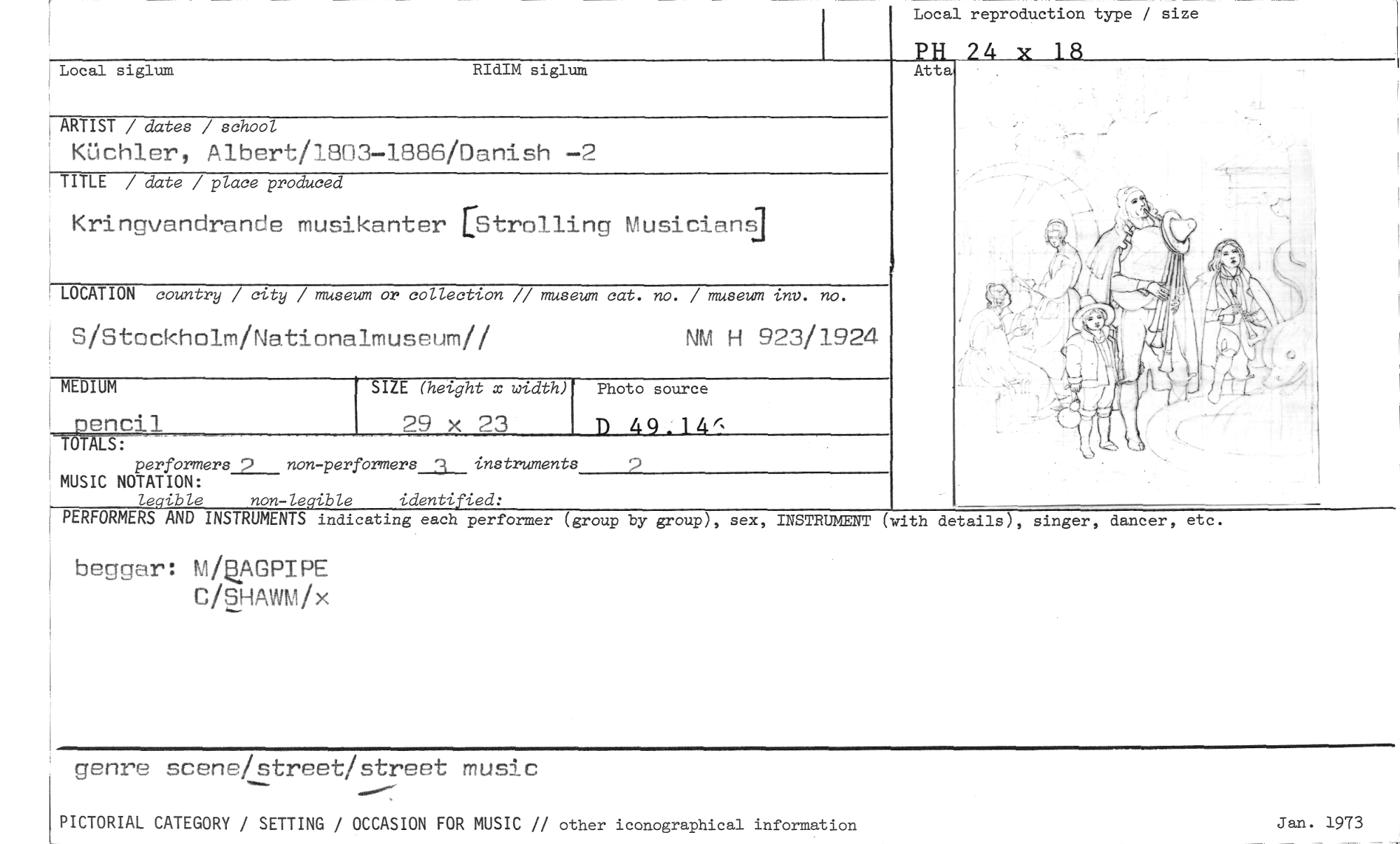 //// Jan. 1973 //// genre scene/street/street music //// PICTORIAL CATEGORY / SETTING / OCCASION FOR MUSIC // other iconographical information //// Local siglum //// Local reproduction type / size //// RIdIM siglum Atta //// S/Stockholm/Netinnalmuseum// //// NM H 923/1924 //// dancer, etc. //// PERFORMERS AND INSTRUMENTS indicating each performer (group by group), sex, INSTRUMENT (with details), singer, //// begnar: M/QAGPIPE //// C/SHAWM/x //// Kringvandrande musikanter [Strolling Musician] //// LOCATION country / city / museum or collection // museum cat. no. / museum inv. no. //// MEDIUM //// encil //// T T LS: perforrners_2__ non -performers_j__ instruments MUSIC NOTATION: //// leqible non-legible identified: //// SIZE (height x width) //// 29 x 23 //// Photo source D 49'14' 2 //// ARTIST / dates / school //// KUchler, Albert/1803-1886/Danish —2 //// TITLE / date / place produced ////