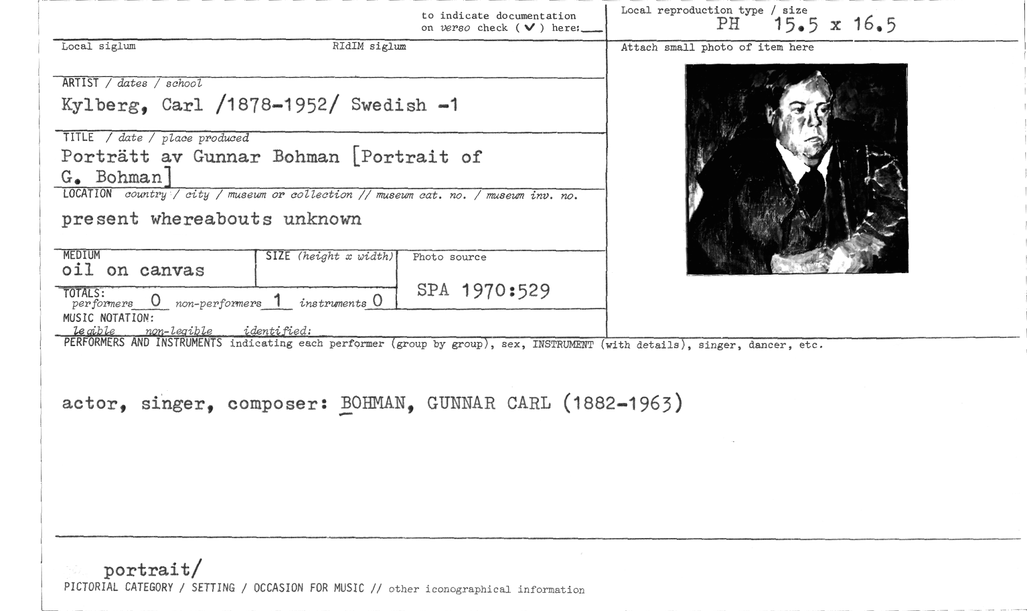 //// to indi sate documentation Local reproduction type / size //// on versa check (V ) here:_ PH 15.5 x 16.5 //// MUSIC NOTATION: //// e 'dent. i-d: //// PERFORMERS AND INSTRUMENTS indicating each performer group by group , sex, INSTRUMENT (with details), singer, dancer, et //// actor, singers composer: BOHMAN. GUNNAR CARL (1882-1963) //// portrait/ //// PICTORIAL CATEGORY / SETTING / OCCASION FOR MUSIC // other iconographical information //// Local siglum //// RIdIM siglum //// Attack small photo of item here //// ARTIST / dates / school //// Kylberg, Carl /1878-1952/ Swedish —1 //// TITLE / date / place produced //// Porträtt av Gunnar Bohman [Portrait of //// G. Bohman] //// LOCATION country / city / museum or collection // museum cat. no. / museum inv. no. //// present whereabouts unknown //// MEDIUM //// oil on canvas //// SIZE (height x width) //// Photo source //// TOTAIS: //// per formers 0 non-per formers 1 instruments 0 //// SPA 1970:529 ////