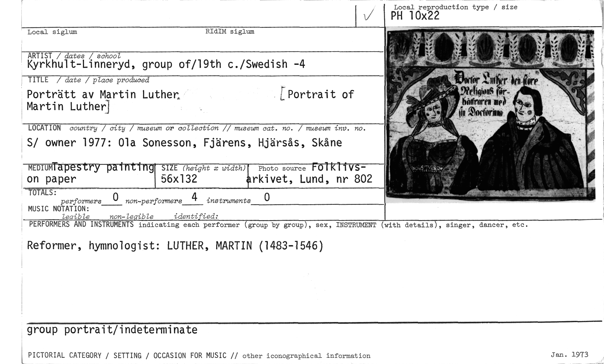 //// Reformer, hymnologist: LUTHER, MARTIN (1483-1546) //// SIZE (he-bght x uidth) //// Photo source Folklivs- //// mEDiumTapestry painting //// Local reproduction type / size //// PH 10x22 //// ARTIST / dates / school //// Kyrkhult-Linneryd, group of/19th c./Swedish -4 //// TITLE / date / place produced //// Porträtt av Martin Luther. Martin Luther] //// LOCATION country / city / museum or collection // museum cat. no. / museum inv. no. //// S/ owner 1977: Ola Sonesson, Fjärens, Hjärsås, Skåne //// floff-0 //// nr ,w r IIQp OrP Yeboons for., tintfrorem 4 »oeforini //// on paper 56x132 arkivet, Lund, nr 802 //// TÖTALS: //// performers0 non-performers 4 instruments 0 //// MUSIC NOTATION: //// leqible non-leqible identified: //// I PERFORMERS AND INSTRUMENTS indicating each performer (group by group), sex, //// INSTRUMENT (with details), singer, dancer, etc. //// group portrait/indeterminate //// PICTORIAL CATEGORY / SETTING / OCCASION FOR MUSIC // other iconographical information Jan. 1973 //// ////