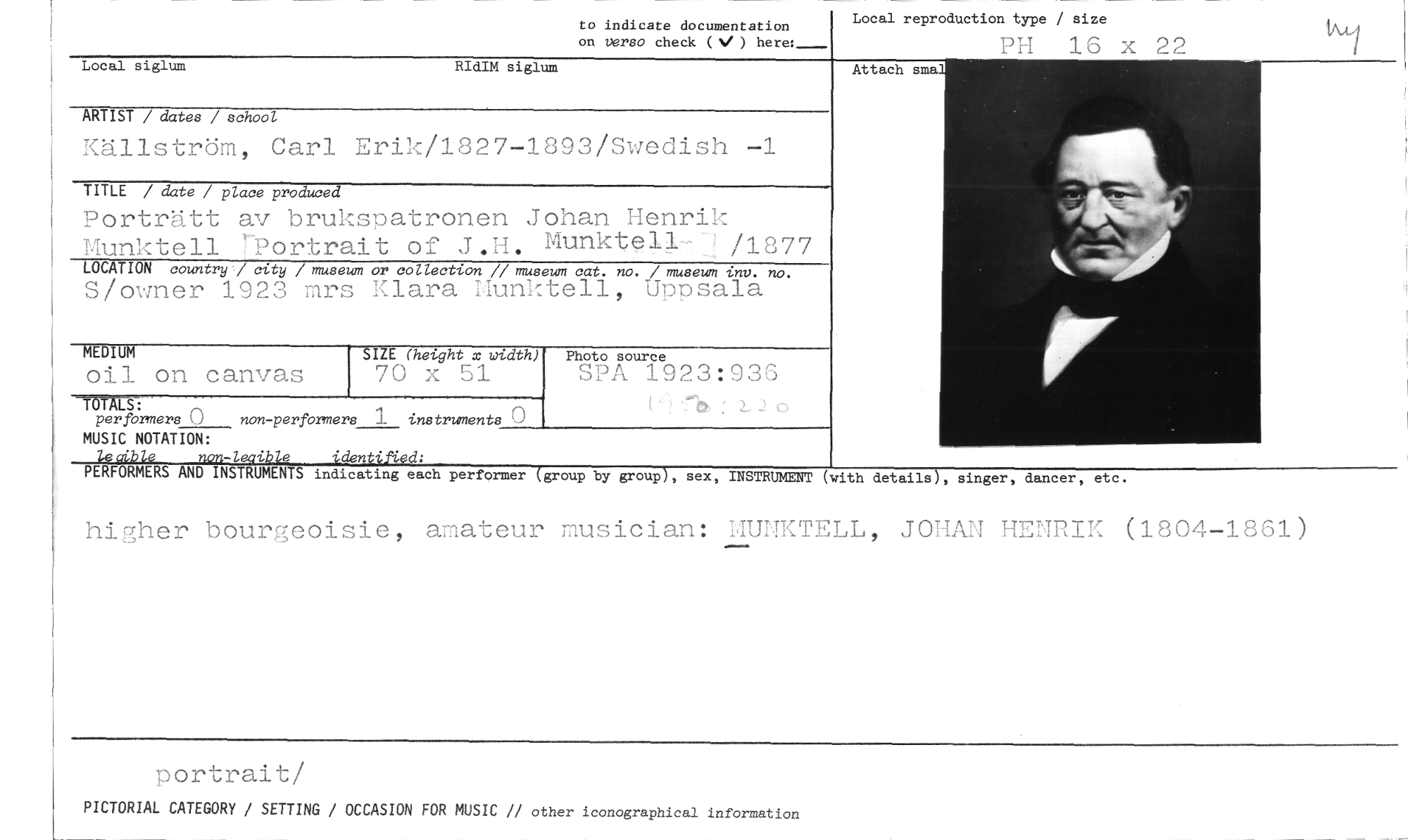 //// to indicate documentation //// on verso check (NI) here:- //// Local siglum RIdIM siglum //// ARTIST / dates / school //// Källström, Carl Erik/1827-1893/Swedish -1 //// TITLE / date / place produced //// Porträtt av brukspatronen Johan Henrik //// - //// Munktell "Portrait of J.H. MunktC1 /1877 //// LOCATION country / city / museum or collection // museum c at. no. / museum 4'vn . no. //// S/owner 1923 mrs Klara liunktell, Uppsala //// Photo source //// SPA 1923:936 //// L //// MUSIC NOTATION: //// non-lecible identified; //// PERFORMERS AND INSTRUMENTS indicating each performer (group by group), sex, //// Local reproduction type / size //// PH 16 x 22 //// details), singer, dancer, etc. //// MEDIUM //// oil on canvas //// per formers 0 non-performers i instruments 0 //// SIZE (height x width) //// 70 x 51 //// INSTRUMENT (with //// higher bourgeoisie, amateur musician: MUNKTELL, JOHAN HENRIK (1804-1861) //// oortrait/ //// PICTORIAL CATEGORY / SETTING / OCCASION FOR MUSIC 1/ other iconographical information ////