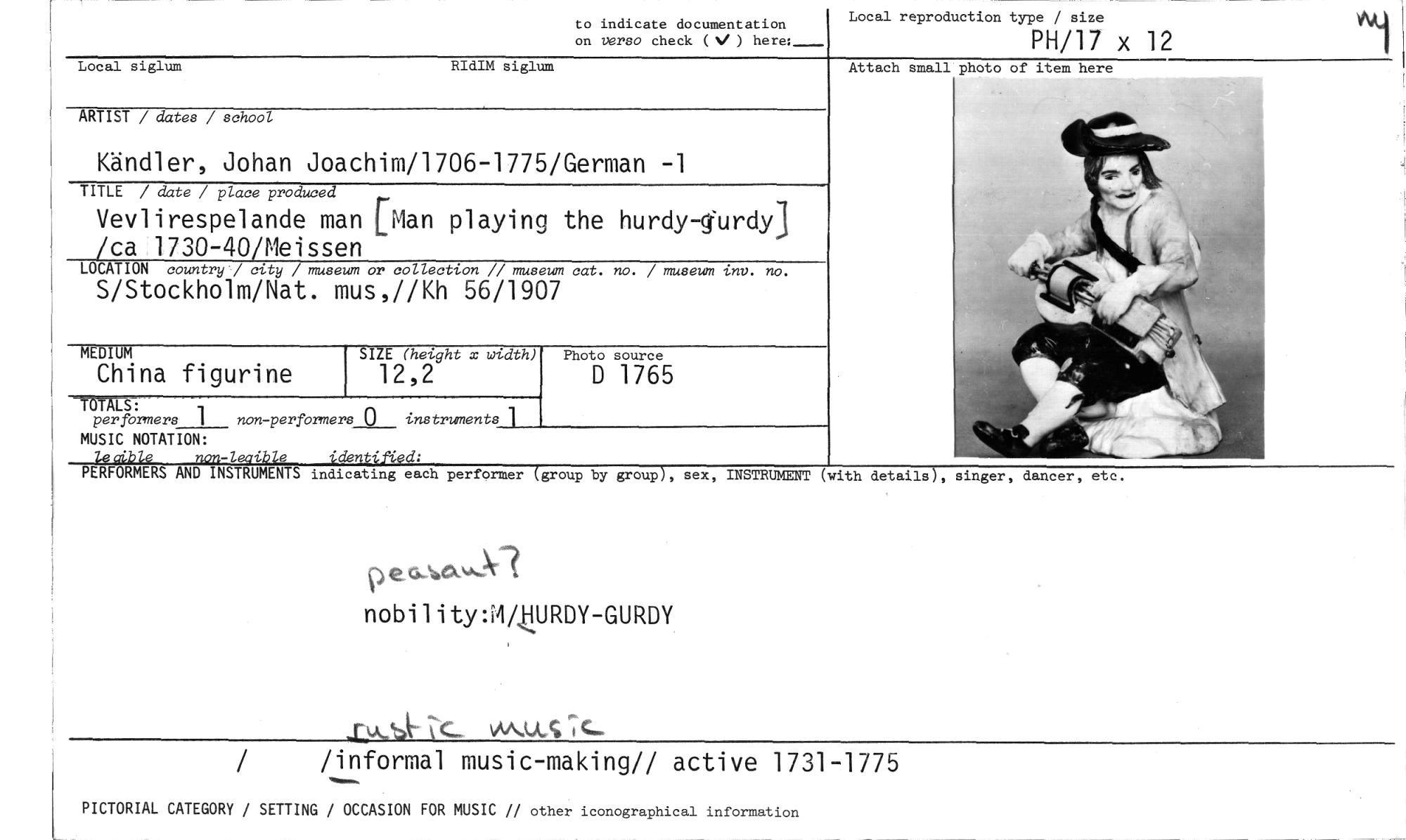 //// nobility:MANURDY-GURDY //// Ze- //// /informal music-making// active 1731-1775 //// PICTORIAL CATEGORY / SETTING / OCCASION FOR MUSIC // other iconographical information //// to indicate documentation //// on verso check ( / ) here:__ //// Local reproduction type / size //// PH/17 x 12 //// Local siglum RIdIM siglum //// ARTIST / dates / school //// Kändler, Johan Joachim/1706-1775/German - //// TITLE / date / place produced //// Vevlirespelande man [Man playing the hurdy-gIrdy //// /ca 1730-40/Meissen //// LOCATION country' city / museum or collection // museum cat. no. / museum inv. no. //// S/Stockholm/Nat. mus,//Kh 56/1907 //// small photo of item here //// MEDIUM //// China figurine //// SIZE (hetght x width) //// 12,2 //// Photo source //// D 1765 //// per formers 1 non-perfOrmers 0 instruments 1 //// MUSIC NOTATION: //// / • 'den d. //// PERFORMERS AND INSTRUMENTS indicating each performer group by group , sex, INSTRUMENT (with details), singer, dancer, et ////