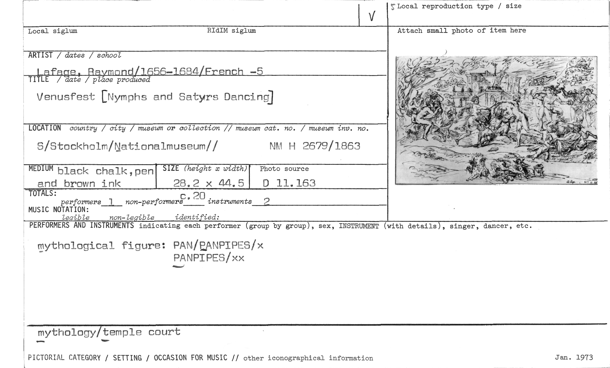 //// r-- //// Local siglum //// rLocal reproduction type / size //// RIdIM siglum //// Attach small photo of item here //// ARTIST / dates / school //// Infags, Raymnn0/1656-1684/French -5 //// TITLE /Wate / place produced //// Venusfest [Nymphs and Satyrs Dancincg //// LOCATION country / city / museum or collection // museum cat. no. / museum inv. no. //// S/Stockholm/Nationalmuseum// NM H 2679/1863 //// MEDIUM black chalk ,pen //// Photo source //// SIZE (height x width) //// and brown ink //// D 11.163 //// 28.2 x 44.5 //// TOT LS: • 20 instruments //// performers 1 non -performers nstruments //// MUSIC NOTATION: //// legible non -Zegible identified: //// PERFORMERS AND INSTRUMENTS indicating each performer (group by group), sex, //// 2 //// INSTRUMENT (with //// details), singer, dancer, etc. //// mythological figure: PAN/PANPIPES/x //// PANPIPES/xx //// mythology/temple court //// PICTORIAL CATEGORY / SETTING / OCCASION FOR MUSIC // other iconographical information //// Jan. 1973 ////