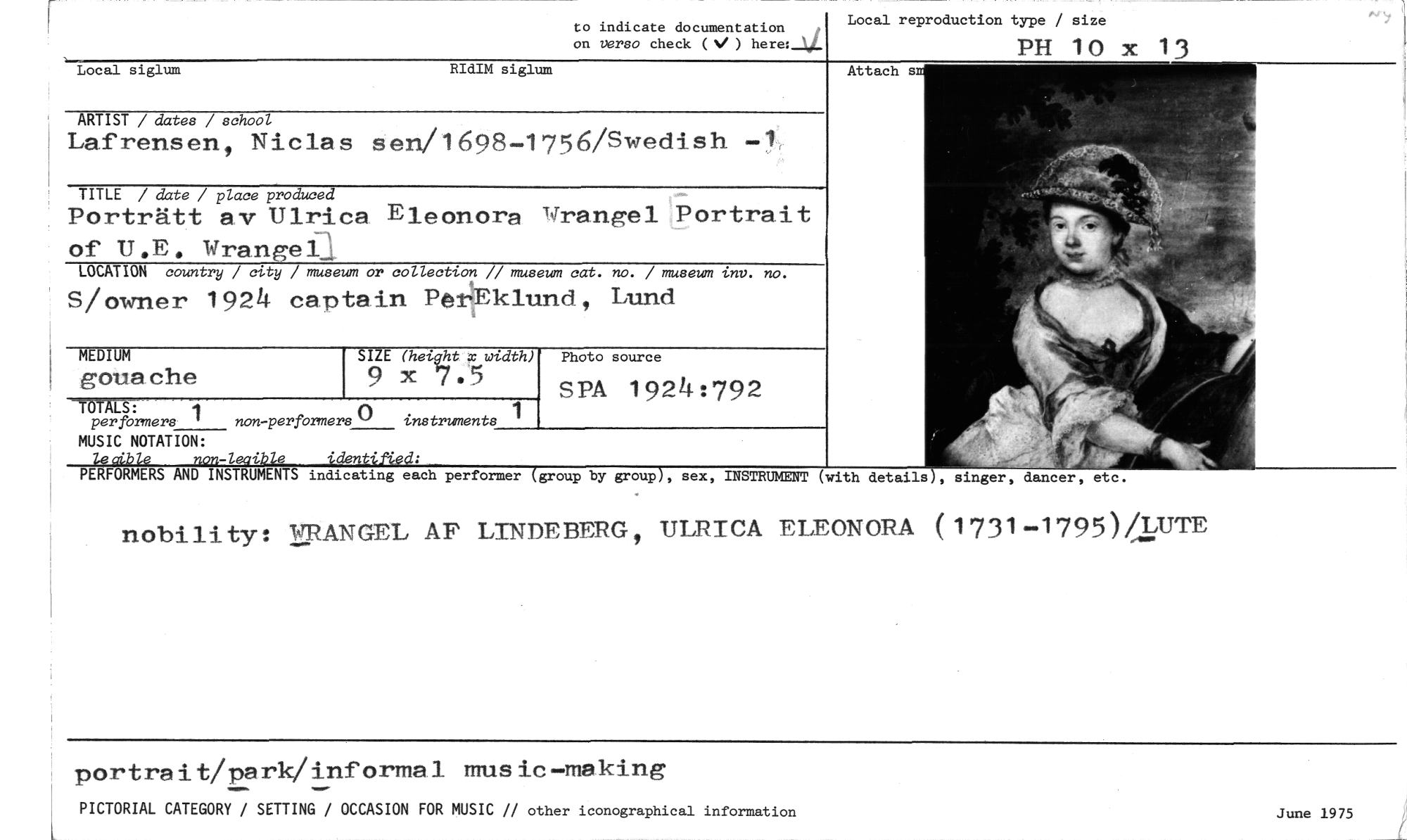 //// to indicate documentation //// on versa check ( ) here:244 //// Local reproduction type / size //// PH 10 x 13 //// Attach s //// Local siglum RIdIM siglum //// ARTIST / dates / school //// Lafrensen, Niclas sen/1698-1756/Swedish - //// TITLE / date / place produced //// Porträtt av Ulrica. Eleonora wrangel Portrait of U , E Wrangeln //// LOCATION country / city / museum or collection // museum cat. no. / museum ini,. no. //// S/ owner 1924 ca pta in PeiZEklund , Lund //// MEDIUM SIZE (hetght x width) Photo source //// goua che 9 x 7.5 SPÅ 1924 : //// -TOMS: non-performers() instruments //// per formers 1 //// MUSIC NOTATION: //// -1 e den //// PERFORMERS AND INSTRUMENTS indicating each performer group by group , sex, INSTRUMENT (with details), singer, dancer, et //// nobi li ty : WRANGEL AF LINDEBERG ULRICA ELEONORA ( 1731 -1795 ) /LUTE //// 792 //// por t ra i t/pa rk/inf orma 1 music-making //// PICTORIAL CATEGORY / SETTING / OCCASION FOR MUSIC // other iconographical information //// June 1975 ////