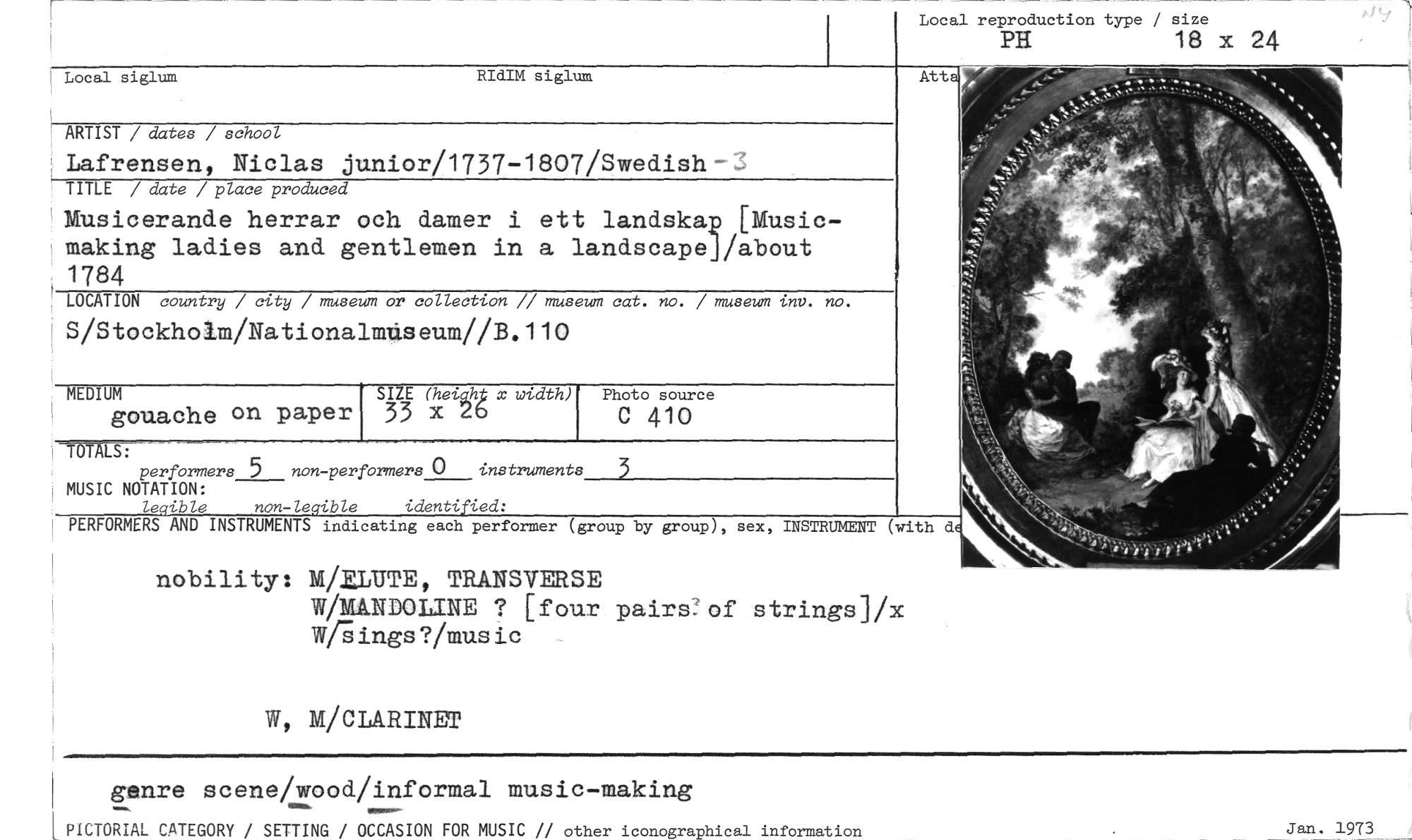 //// genre scene/wood/informal music-making //// PICTORIAL CATEGORY / SETTING / OCCASION FOR MUSIC // other iconographical information //// Jan. 1973 //// 3 //// OTALS: performers 5 non-performers 0 instruments MUSIC NOTATION: //// legible non-legible identified: //// PERFORMERS AND INSTRUMENTS indicating each performer (group by group), sex, INSTRUMENT (with d //// Local siglum RIdIM siglum //// ARTIST / dates / school //// Lafrensen, Niclas junior/1737-1807/Swedish-_ //// TITLE / date / place produced //// Musicerande herrar och damer i ett landskap [Music-making ladies and gentlemen in a landscapej/about 1784 //// LOCATION country / city / museum or collection // museum cat. no. / museum tnv. no. //// S/Stockholm/Nationalmiseum//B.110 //// Local reproduction type / size //// PH 18 x 24 //// Åtta //// MEDIUM //// gouache on paper //// SIZE (hetlh x width) //// 33 x 26 //// Photo source //// C 410 //// nobility: M/ELUTE, TRANSVERSE //// W/MANDOLINE [four pairs7of strings]/x W5ings?/music //// W, M/CLARINET ////