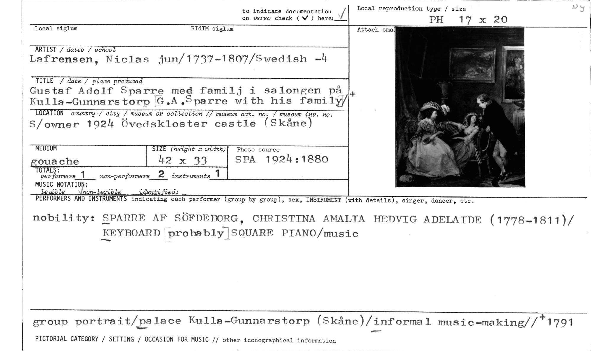 //// to indicate documentation //// on verso check ( ) here:- //// Local reproduction type / size //// PH 17 x 20 //// Local siglum RIdIM siglum //// ARTIST / dates / school //// Lafrensen, Niclas jun/1737-1807/Swedish -4 //// TITLE / date / place produced //// Gustaf Adolf Sparre med familj i salongen på Kulla-Gunnarstorp,G.A.Sparre with his family/ //// LOCATION country / city / museum or collection // museum cat. no. / museum lxv. no. //// S/owner 1924 Övedskloster castle (Skåne) //// MEDIUM //// gouache //// -TOTALS: //// per formers 1 non-perförmers 2 instruments 1 //// MUSIC NOTATION: //// leaible -inon-leaible identified: //// PERFORMERS AND INSTRUMENTS indicating each performer (group by group), sex, INSTRUMENT (with details), singer, dancer, etc. //// nobility: SPARRE AF SöFDEBORG, CHRISTINA AMALIA HEDVIG ADELAIDE (1778-1811)/ KEYBOARD probably SOUARE PIANO/music //// Attach sma //// SIZE (height x width) //// 42 x 33 //// Photo source //// SPA 1924:1880 //// group portrait/palace Kulla-Gunnarstorp (Skåne)/informal music-making//+1791 //// PICTORIAL CATEGORY / SETTING / OCCASION FOR MUSIC // other iconographical information ////
