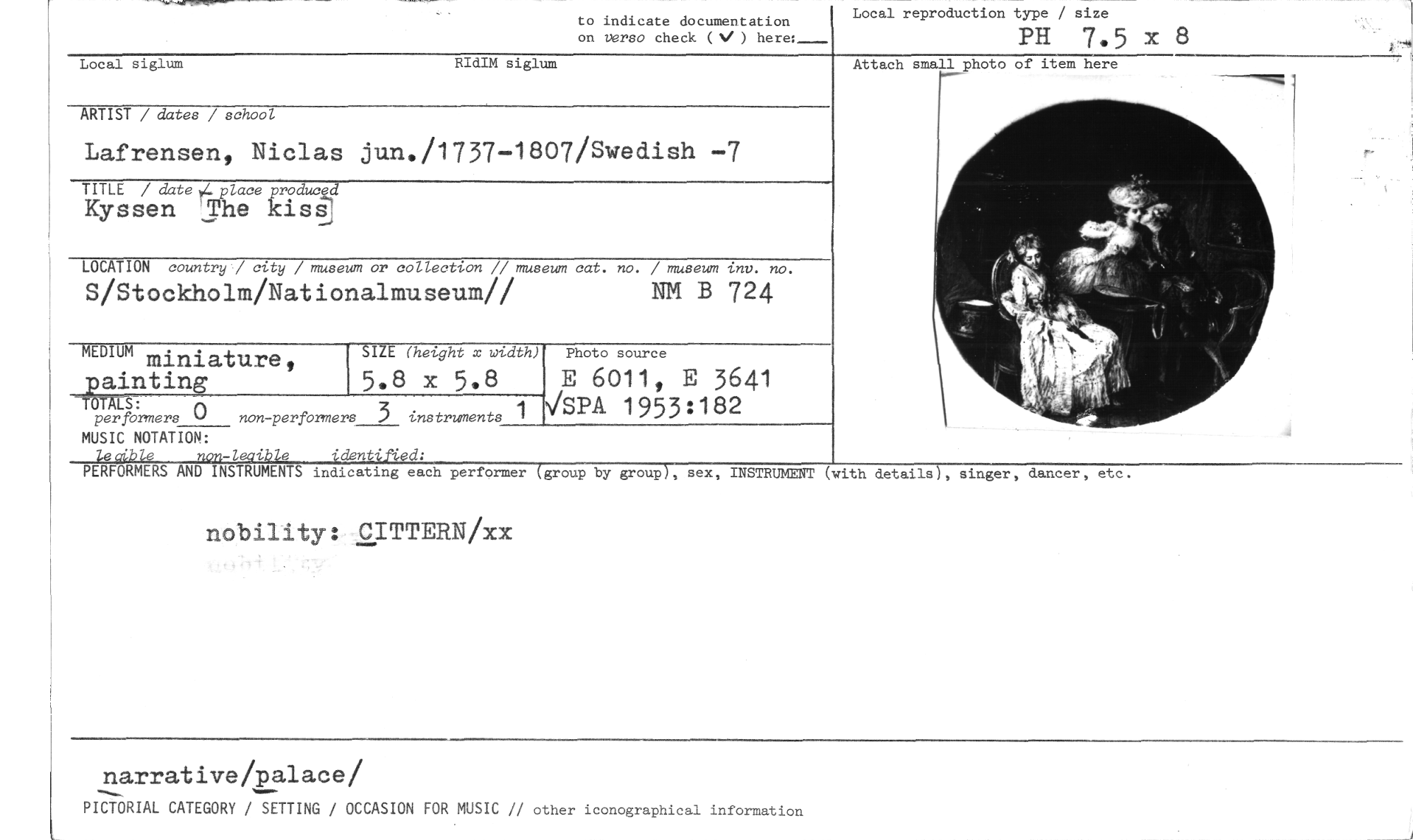 //// to indicate documentation on verso check ( ) here: //// Local reproduction type / size //// PH 7.5 x 8 //// Local siglum RIdIM siglum //// ARTIST / dates / school //// Lafrensen, Niclas jun./1737-1807/Swedish -7 //// TITLE / date 14 place produced //// Kyssen 'The kiss: //// LOCATION country / city / museum or collection // museum cat. no. / museum inv. no. //// S/Stockholm/Nationalmuseum// NM B 724 //// SIZE (height x width) Photo source //// non-performers 3 instruments 1 //// 5.8 x 5.8 E 6011, E 3641 //// ISPA 1953:182 //// identified: //// Attach small photo of item here //// MEDIUM • • //// miniature, painting //// TOTATS: //// per formers //// MUSIC NOTATION: //// lealble non-legibie //// PERFORMERS AND INSTRUMENTS indicating each performer (group by group), sex, INSTRUMENT (with details), singer, dancer, etc. //// nobility: CITTERN/xx //// narrative/palace/ //// PICTORIAL CATEGORY / SETTING / OCCASION FOR MUSIC // other iconographical information ////