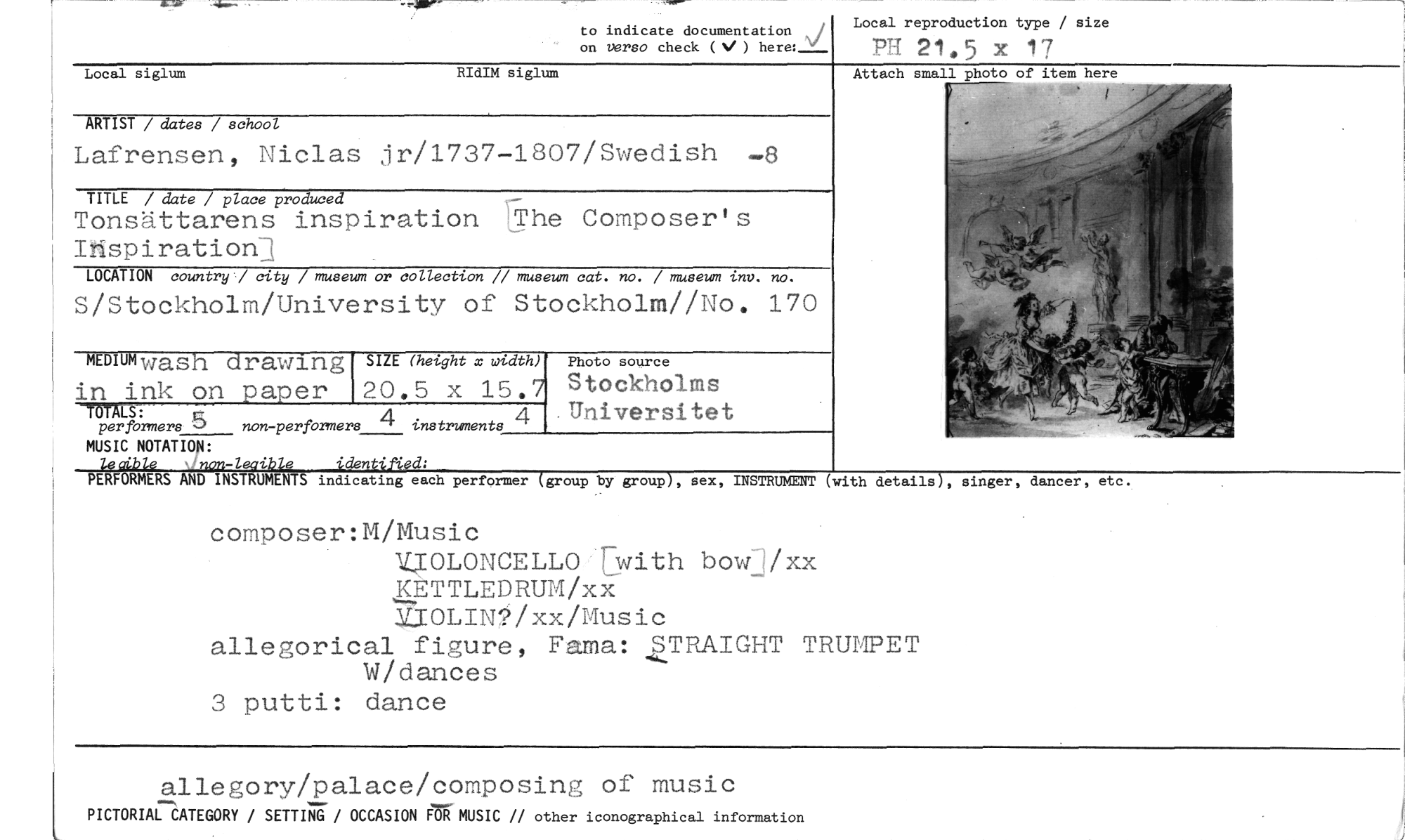 //// to indicate documentation on versa check ( ) Local reproduction type / size //// PH 21.5 x 17 //// Local siglum RIdIM siglum //// LOCATION country / city / museum or collection // museum cat. no. / museum inv. no. //// S/Stockholm/University of Stockholm//No. 170 //// MEDIumiviash cirawing SIZE (height x width) //// in ink on paper 20.5 x 15.7 //// perfbrmers non-performers 4 instruments //// MUSIC NOTATION: //// kyib/e 'non-leoible identified: //// PERFORMERS AND INSTRUMENTS indicating each performer (group by group), sex, INSTRUMENT //// (with details), singer, dancer, etc. //// Attach small photo of item here //// i //// ARTIST / dates / school //// Lafrensen, Niclas jr/1737-1807/Swedish //// TITLE / date / place produced //// Tonsättarens inspiration The Composer's Ihspirationi //// Photo source //// Stockholms Universitet //// com oser:M/Music //// MJOLONCELLO ;with with bowj/xx KETTLEDRUM/xx //// Y3OLIN?/xx/Music //// allegorical figure, Farna: TRAIGHT TRUMPET W/dances //// 3 putti: dance //// allegory/palace/composing of music //// PICTORIAL CATEGORY / SETTING / OCCASION FOR MUSIC // other iconographical information ////