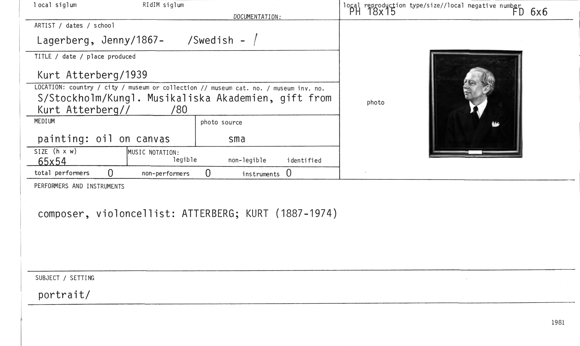 //// 1 ocal siglum RIdIM siglum //// DOCUMENTATION. //// rpKodwction type/size//local negative numb£Fr //// 146X ID 6x6 //// ARTIST / dates / school //// Lagerberg, Jenny/1867- /Swedish - //// TITLE / date / place produced //// Kurt Atterberg/1939 //// LOCATION: country / city / museum or collection // museum cat. no. / museum inv. no. //// S/Stockholm/Kungl. Musikaliska Akademien, gift from Kurt Atterberq// /80 //// MEDIUM photo source //// //// painting: oil on canvas sma //// SIZE (h x w) MUSIC NOTATION: //// 65x54 legible non-legible identified //// //// //// photo //// total performers 0 non-performers 0 instruments 0 //// PERFORMERS AND INSTRUMENTS //// composer, violoncellist: ATTERBERG; KURT (1887-1974) //// SUBJECT / SETTING //// portrait/ //// 1981 ////