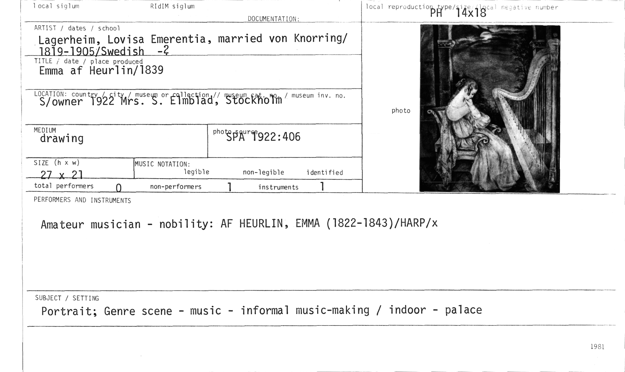 //// 1 otal siglum //// R dIM siglum //// DOCUMENTATION: //// ocel repri,ductior re/1 14-kläc, //// ARTIST / dates / school //// Lagerheim, Lovisa Emerentia, married von Knorring/ 1819-1905/Swedish 4 //// TITLE date / place produced //// Emma af Heurlin/1839 //// LOCATION: country / ty_ / //// S/owner f92z mr //// MEDIUM //// drawing //// SIZE (h x w) //// 27 x 21 //// total performers //// PERFORMERS AND INSTRUMENTS //// u.s e t or cånd /,/ tut kaht 0 lorn / museum i n v . no. //// MUSIC NOTATION: //// legible //// P"tOrT922:406 //// non-legible i denti fi ed //// 0 //// non-performers //// 1 //// instruments //// 1 //// Amateur musician - nobility: AF HEURLIN, EMMA (1822-1843)/HARP/x //// SUBJECT / SETTING //// Portrait; Genre scene - music - informal music-making / indoor - palace //// 1981 ////