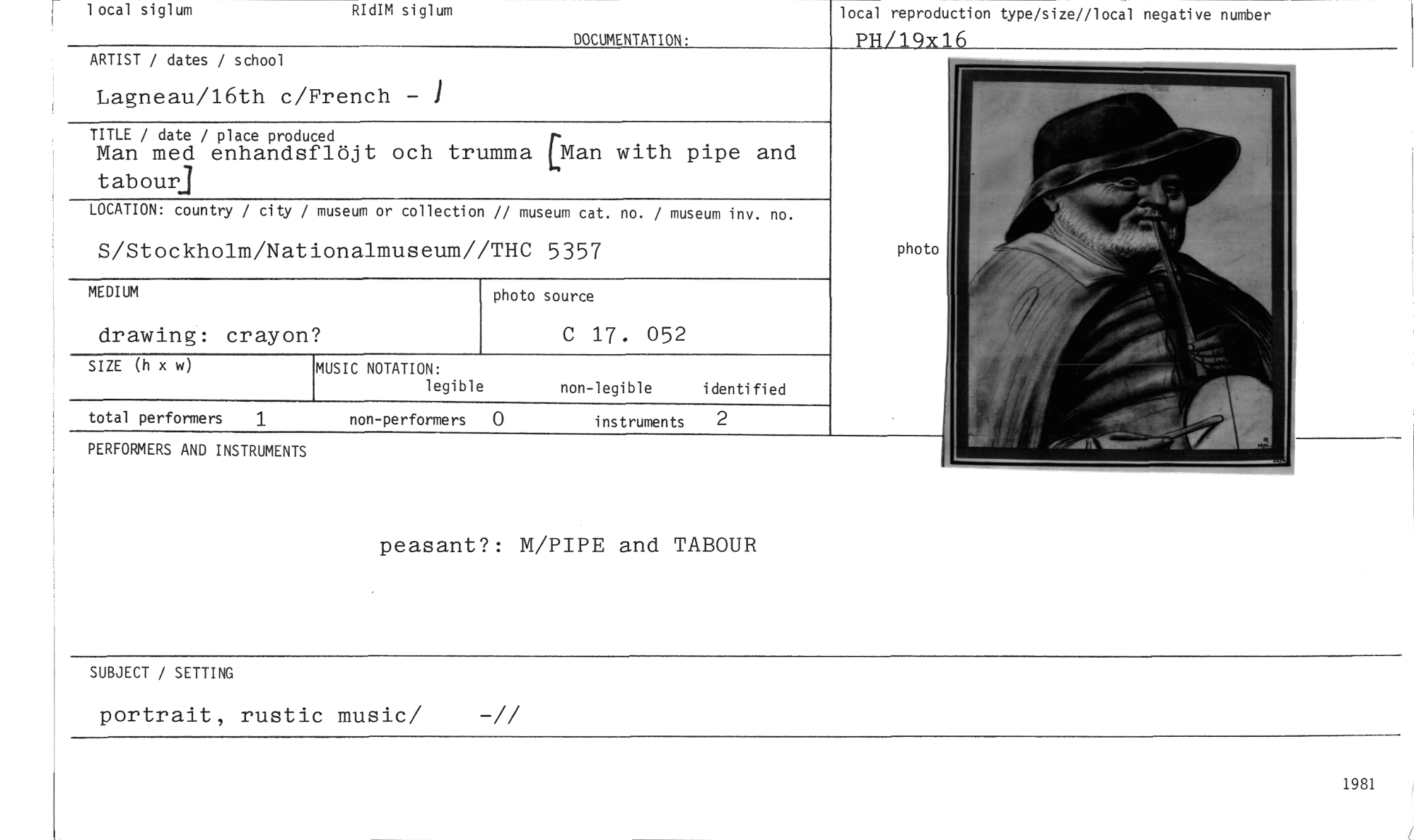 //// [ local siglum RIdIM siglum //// DOCUMENTATION: //// local reproduction type/size//local negative number //// PH/19x16 //// ARTIST / dates / school //// Lagneau/16th c/French - //// TITLE / date / place produced //// Man med enhandsflöjt och trumma [Man with pipe and tabourj //// LOCATION: country / city / museum or collection // museum cat. no. / museum inv. no. //// S/Stockholm/Nationalmuseum//THC 5357 //// MEDIUM photo source //// drawing: crayon? C 17. 052 //// SIZE (h x w) MUSIC NOTATION: non-legible identified //// legible //// total performers 1 non-performers 0 instruments 2 //// PERFORMERS AND INSTRUMENTS //// photo //// peasant?: M/PIPE and TABOUR //// SUBJECT / SETTING //// portrait, rustic music/ —7/ ////
