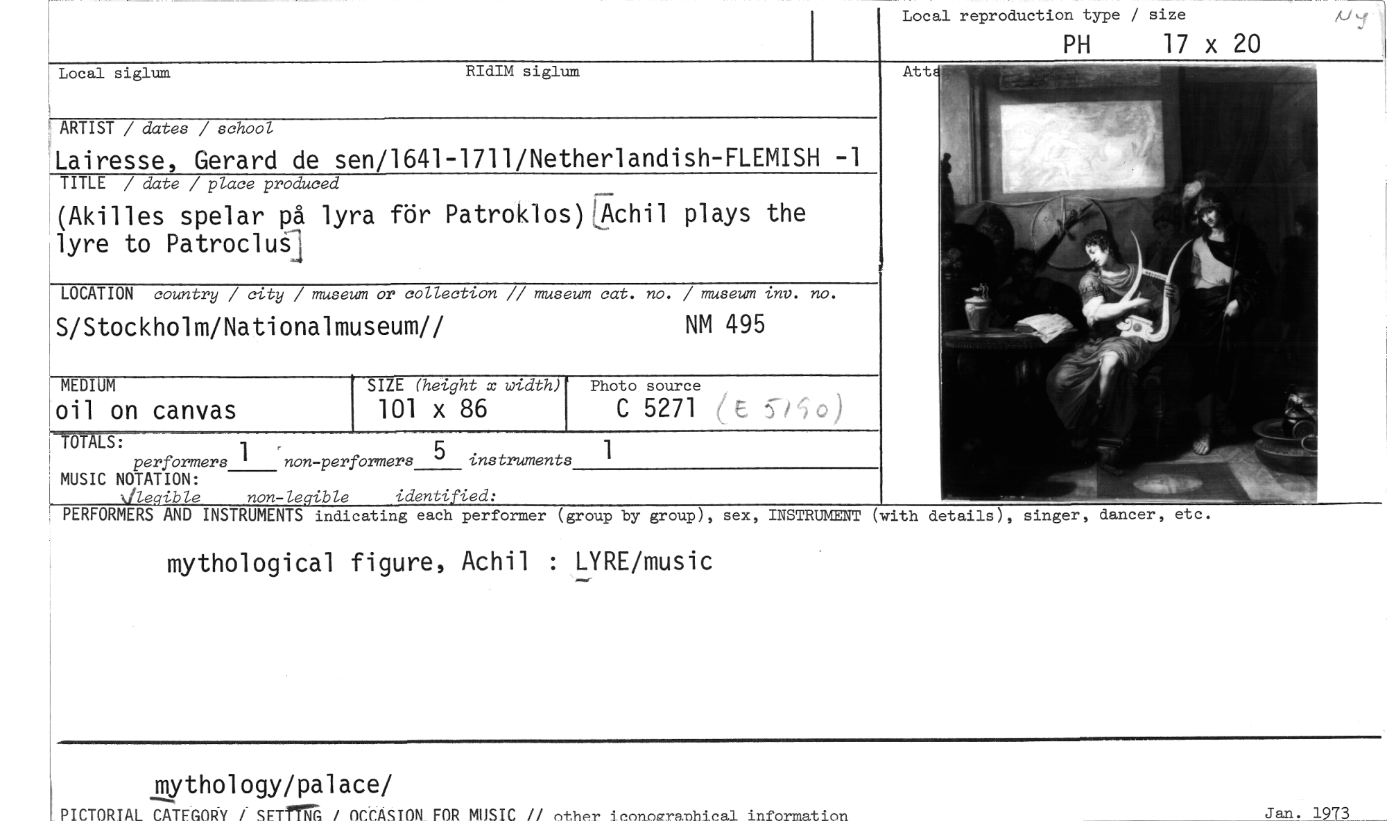 //// mythological figure, Achil : LYRE/music //// mythology/palace/ //// PICTORIAL CATFGORY / SETfTrO / OCCASION FOR MUSIC // other iconouramhical information Jan. 1973 //// At //// NM 495 //// S/Stockholm/Nationalmuseum// //// details), singer, dancer, etc. //// PERFORMERS AND INSTRUMENTS indicating each performer (group by group), sex, INSTRUMENT (with //// Local reproduction type / size //// PH 17 x 20 //// Local siglum RIdIM siglum //// ARTIST / dates / school //// Lairesse, Gerard de sen/1641-1711/Netherlandish-FLEMISH — //// TITLE / date / place produced //// r- //// (Akilles spelar på lyra för Patroklos) Achil plays the lyre to PatrocluS1 //// LOCATION country / city / museum or collection // museum cat. no. / museum tnv. no. //// MEDIUM SIZE (height x width) Photo source //// oil on canvas 101 x 86 C 5271 //// TOTALS: //// performers 1 1 //// non-performers 5 instruments //// MUSIC NOTATION: //// allegible non-legible identified: ////
