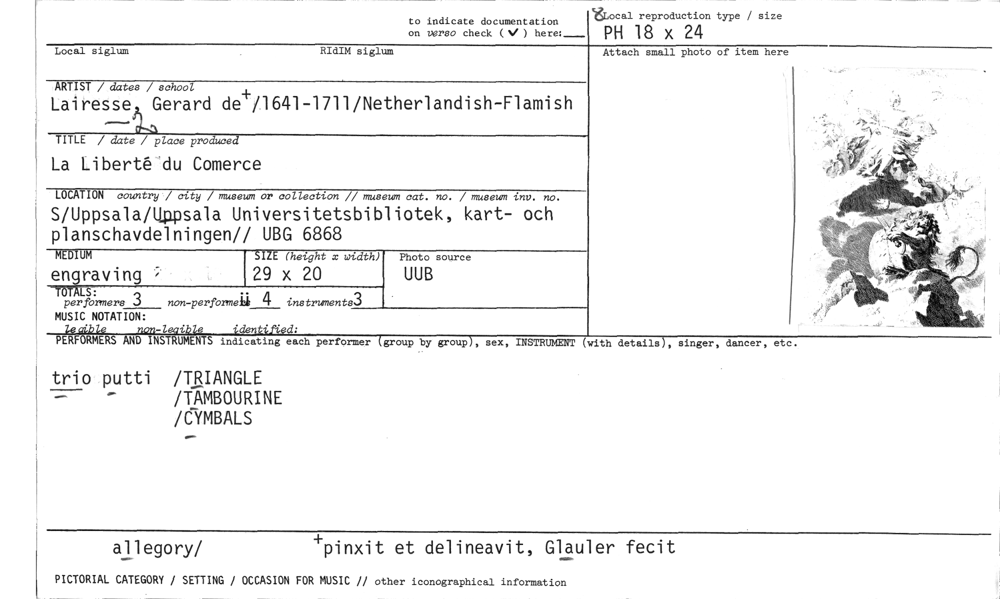 //// to indicate documentation //// on verso check (V ) here: //// 'dLocal reproduction type / size //// PH 18 x 24 //// Attach small photo of item here //// Local siglum RIdIM siglum //// ARTIST / dates / school //// Lairesset Gerard de+/1641-1711/Netherlandish-Flamish //// TITLE / date / place p oduced //// La LiberWdu Comerce //// LOCATION country / city / museum or collection // museum cat. no. / museum inv. no. //// S/Uppsala/U.ppsala Universitetsbibliotek, kart- och planschavdelningen// UBG 6868 //// MEDIUM //// engraving //// SIZE (height x width) //// 29 x 20 //// Photo source //// UUB //// T6Ths: //// per formers 3 non-performell 4 instruments3 //// MUSIC NOTATION: //// le aible non-leaible //// PERFORMERS AND INSTRUMENTS //// indicating each performer (group by group), sex, INSTRUMENT (with details), singer, dancer, etc. //// trio putti /TRIANGLE //// /TAMBOURINE /CYMBALS //// allegory/ +pinxit et delineavit, Glauler fecit //// PICTORIAL CATEGORY / SETTING / OCCASION FOR MUSIC // other iconographical information ////