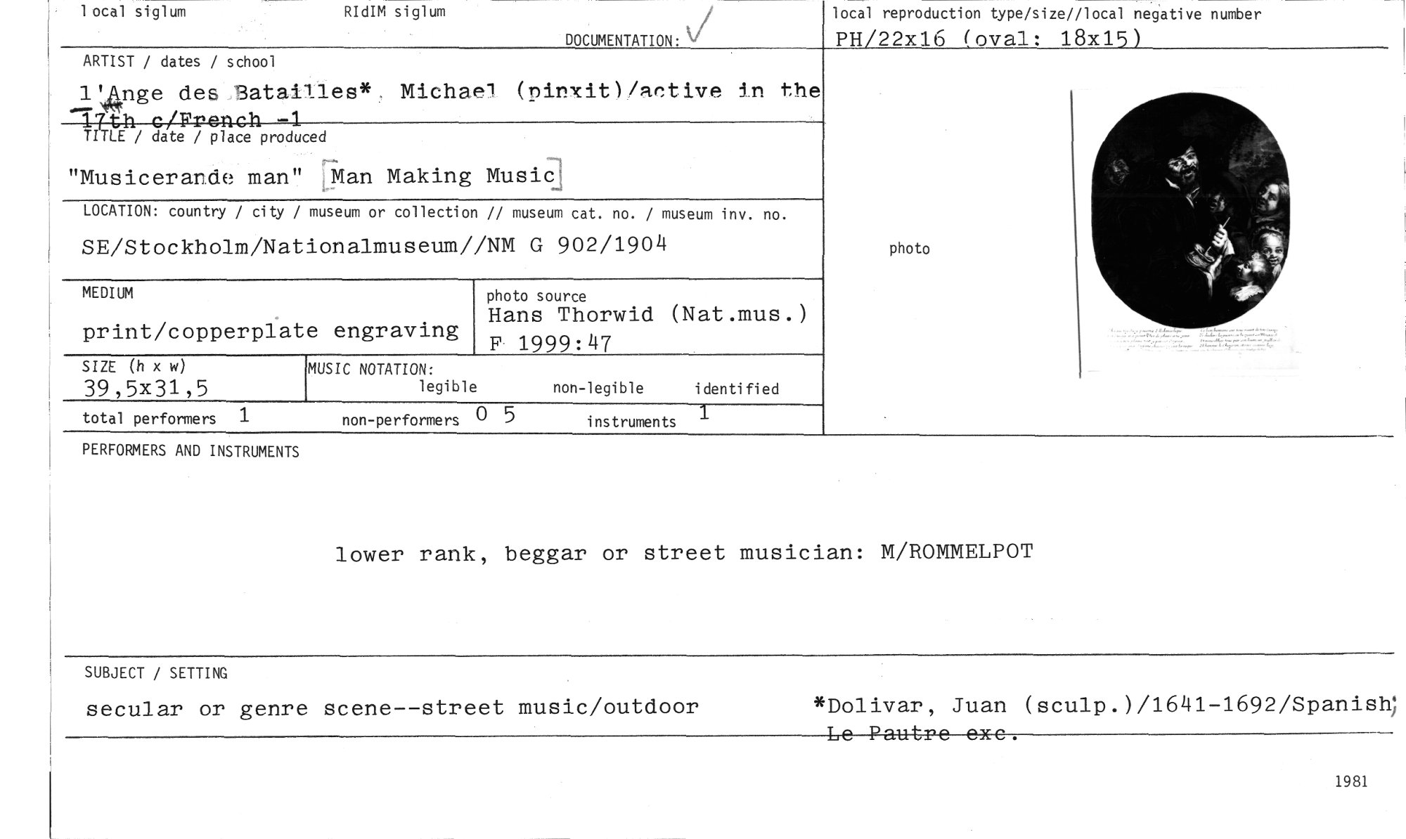 //// local siglum RIdIM siglum //// local reproduction type/size//local negative number //// PH/22x16 (oval: 18x15) //// DOCUMENTATION: //// ARTIST / dates / school //// 1Wpge des,Bataitles* Michael (pinxit)/active in the //// -ITth c/French -1 TULE / date / place produced //// "Musicerande man" [Man Making Music //// LOCATION: country / city / museum or collection // museum cat. no. / museum inv. no. //// SE/Stockholm/Nationalmuseum//NM G 902/1904 //// photo source //// Hans Thorwid (Nat.mus.) F 1999:47 //// SIZE (h x w) //// 39,5x31,5 //// total performers 1 non-performers 5 instruments 1 //// MEDIUM //// print/copperplate engraving //// MUSIC NOTATION: //// legible non-legible identified //// photo //// PERFORMERS AND INSTRUMENTS //// lower rank, beggar or street musician: M/ROMMELPOT //// SUBJECT / SETTING //// secular or genre scene--street music/outdoor *Dolivar, Juan (sculp.)/1641-1692/Spanish' //// 1981 ////