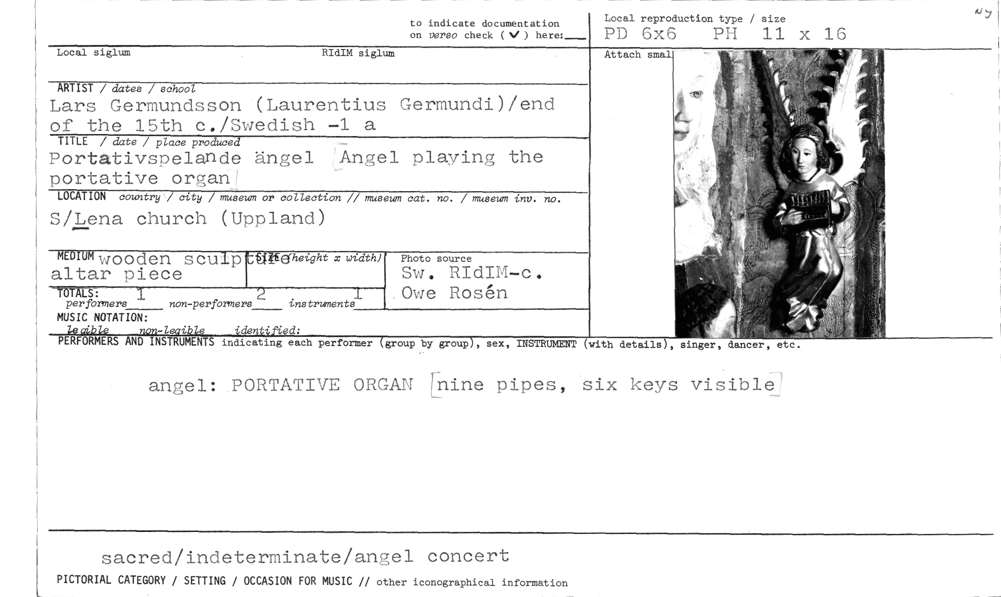 //// Fly //// to indicate documentation //// on verso check (V ) here:- //// Local reproduction type / size //// PD 6x6 PH 11 x 16 //// Local siglum RIdIM siglum //// ARTIST / dates / school //// Lars Germundsson (Laurentius Germundi)/end of the 15th c./Swedish -1 a //// TITLE / date / place produced //// Portativspelånde ängel Angel playing the portative organ' //// LOCATION country / city / museum or collection // museum cat. no. / museum inv. no. //// S/Lena church (Uppland) //// Attach smal //// MEDIUM wooden sculp kftEe'height x width) //// altar piece //// -1VM77---1 1--- //// per formers non-perfermers instruments //// MUSIC NOTATION: //// lecibLe non-leaible identified: //// Photo source //// Sw. //// Owe Rosen //// PERFORMERS AND INSTRUMENTS indicating each performer (group by group), sex, INSTRUMENT (with details), stinger, dancer //// angel: PORTATIVE ORGAN [nine pipes, six keys visiblel //// etc. //// sacred/indeterminate/angel concert //// PICTORIAL CATEGORY / SETTING / OCCASION FOR MUSIC // other iconographical information ////