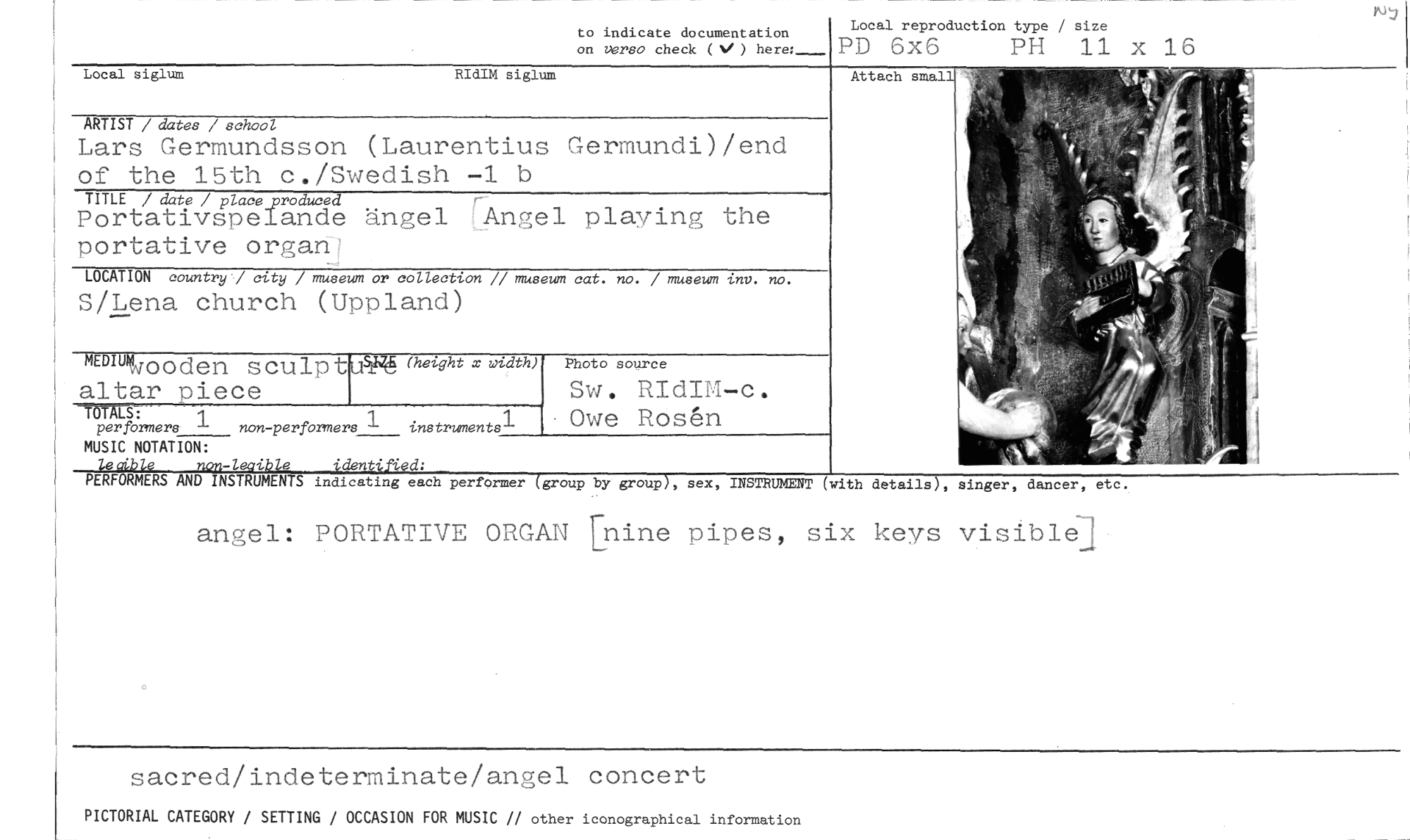 //// to indicate documentation //// on vero check (V) here:- //// Local reproduction type / size //// PD 6x6 PH 11 x 16 //// Attach //// j //// Local siglum RIdIM siglum //// ARTIST / dates / school //// Lars Germundsson (Laurentius Germundi)/end of the 15th c./Swedish -1 b //// TITLE / date / place produced //// PortativspeIande ängel Angel playing the portative organ- //// LOCATION country? city / museum or collection // museum cat. no. / museum inv. no. //// S/Lena church (Uppland) mnium- //// wooden sculptusffi (height x width) //// altar piece //// per formers non -perfOrmers instruments1 //// MUSIC NOTATION: //// non-lectible identified: //// PERFURMERS AND INSTRUMENTS indicating each //// angel: PORTATIVE ORGAN mine pipes, six keys visiblel //// -TOTALS: //// Photo source //// Sw. RIdIM-c. Owe Rösén //// performer (group by group), sex, INSTRUMENT (with details), sånger, dancer, etc. //// sacred/indeterminate/angel concert //// PICTORIAL CATEGORY / SETTING / OCCASION FOR MUSIC // other iconographical information ////