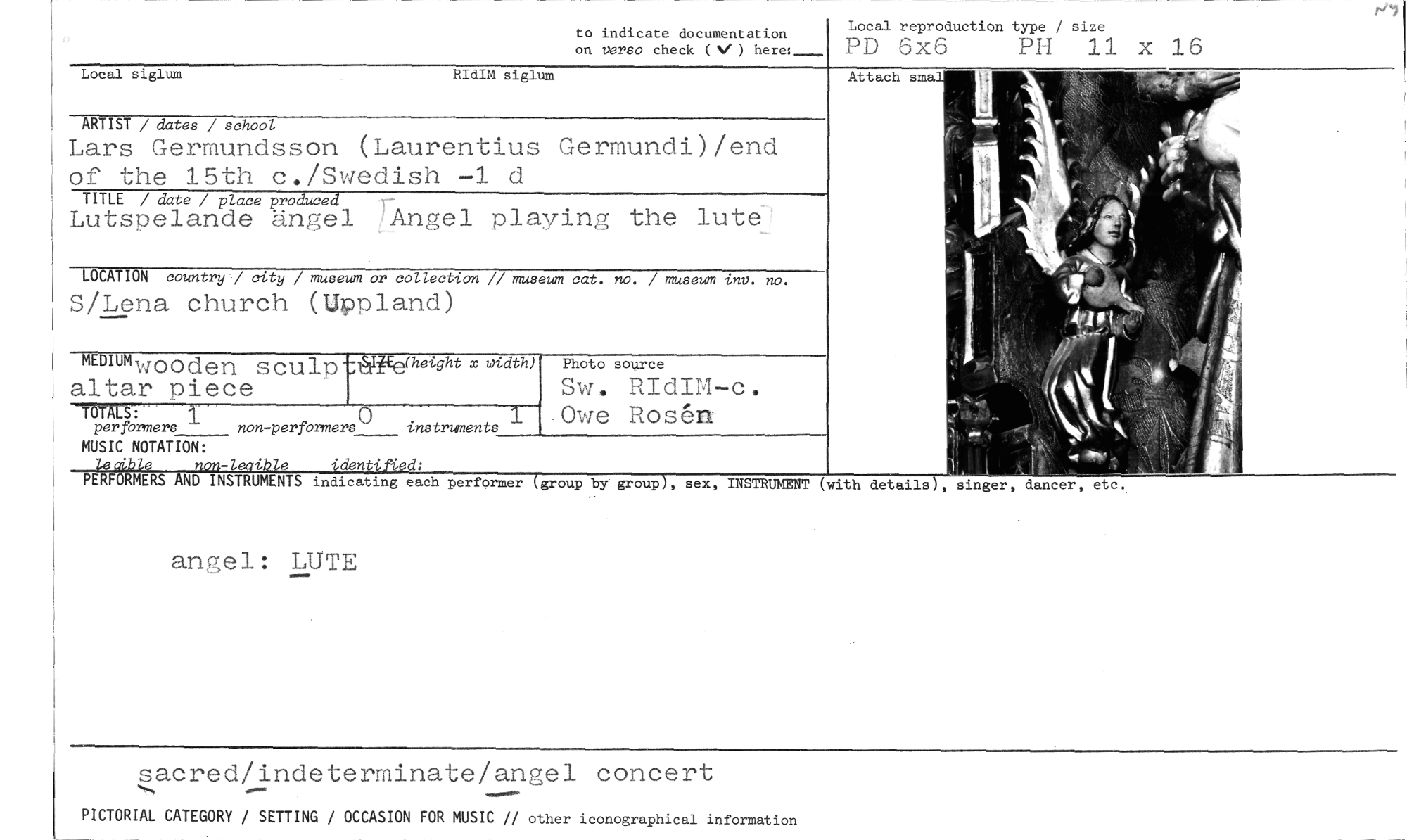 //// sacred/indeterminate/angel concert //// PICTORIAL CATEGORY / SETTING / OCCASION FOR MUSIC // other iconographical information //// to indicate documentation //// on verso check (V ) here:— //// Local reproduction type / size //// PD 6x6 PH 11 x 16 //// siglum RIdIM siglum //// ARTIST / dates / school //// Lars Germundsson (Laurentius Germundi)/end of the 15th c./Swedish -1 d //// TITLE / date / place ,roduced i- //// Lutspelande angel rAngel playing the lute //// LOCATION country'/ city / museum or collection // museum cat. no. / museum inv. no. //// S/Lena church (Uppland) //// MEDIUM wooden sculp -Agife(hetght x width) //// altar piece //// non-performers v instruments //// Photo source //// Sw. RIdIM-c. Owe Rosén //// 1""7-1 //// per formers //// MUSIC NOTATION: //// F•RMERS AND INSTRUMENTS indicating each performer group by group , sex, INSTRUMENT (with details , singer, dancer, etc. //// anfl,e1: LUTE ////