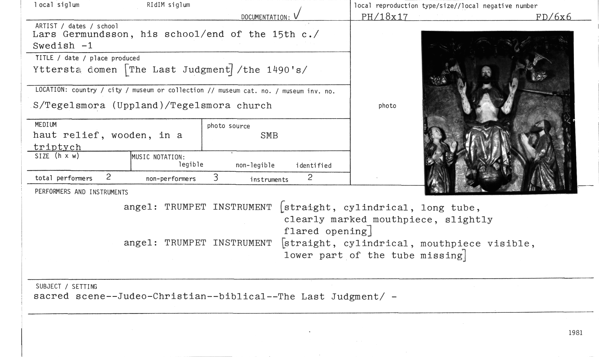 //// local siglum RIdIM siglum //// DOCUMENTATION: i //// local reproduction type/size//local negative number //// PH/18x17 FD/6x6 //// ARTIST / dates / school //// Lars Germundsson, his school/end of the 15th c./ Swedish -1 //// TITLE / date / place produced //// Yttersta domen [The Last Judgmentl/the 1490's/ //// LOCATION: country / city / museum or collection // museum cat. no. / museum inv. no. //// S/Tegelsmora (Uppland)/Tegelsmora church //// MEDIUM photo source //// haut relief, wooden, in a SMB //// triptych //// SIZE (h x w) MUSIC NOTATION: //// legible non-legible identified //// total performers 2 non-performers 3 instruments 2 //// PERFORMERS AND INSTRUMENTS //// angel: TRUMPET INSTRUMENT [straight, cylindrical, long tube, //// clearly marked mouthpiece, slightly flared opening] //// angel: TRUMPET INSTRUMENT [straight, cylindrical, mouthpiece visible, lower part of the tube missing] //// SUBJECT / SETTING //// sacred scene--Judeo-Christian--biblical--The Last Judgment/ - //// 1981 ////